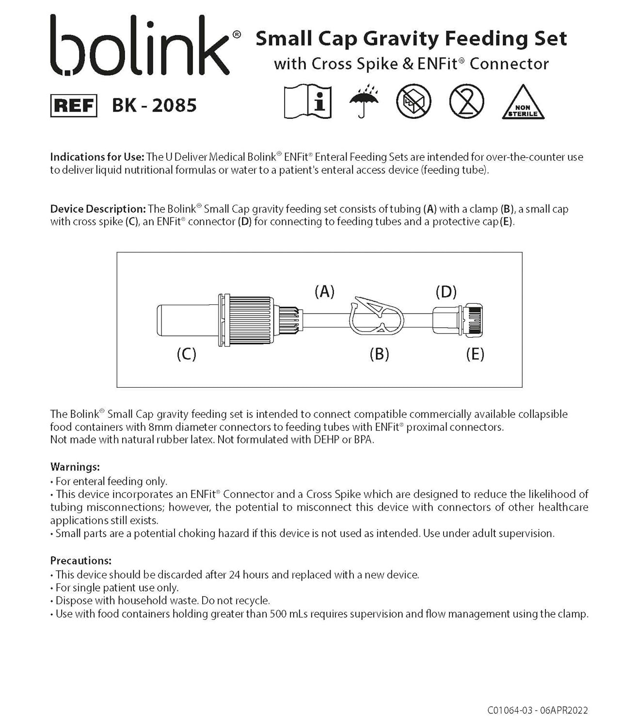 The Bolink Small Cap is for home tube feeding. Individually packaged for cleanliness