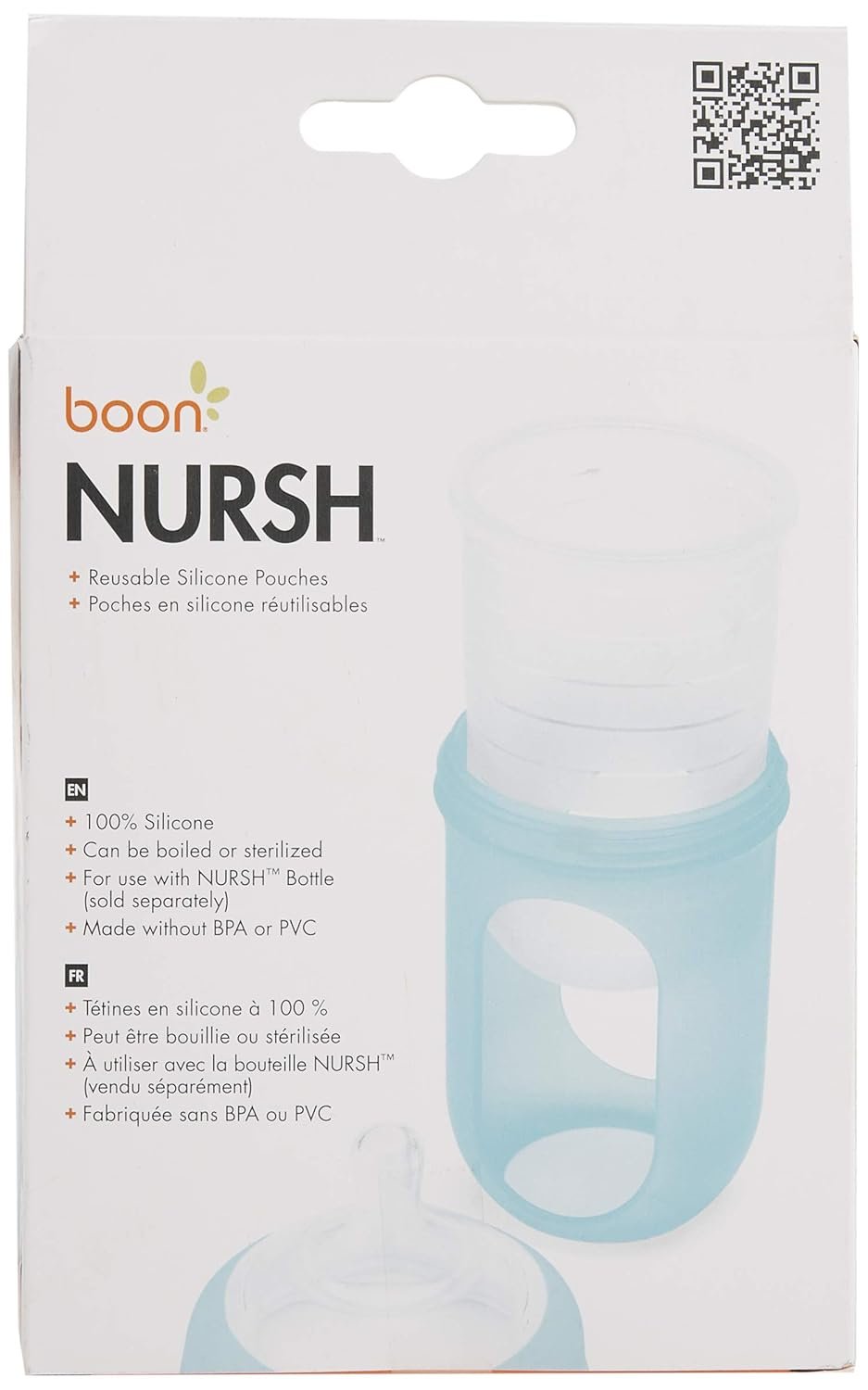 Innovation. Suck on that! It’s the best thing to happen to feeding since nipples. Thanks to the pouch the revolutionary air-free feeding design of our 100% Silicone Nursh Bottles collapses as your little one drinks, squeezing out the nasty gas-inducing air that causes colic. No straws, vents or valves here—so it’s a snap to clean and assemble. The silicone of these reusable pouches can even be boiled, sterilized, and frozen, making it perfect for baby’s mealtime at any time of day. The pouches are dishwasher safe for quick and easy cleaning that makes taking care of them a snap. These silicone pouches are great way to extend your supply of existing shells, making sure you always have a baby bottle handy even when another pouch is in the dishwasher. (You’re a parent, you know how many bottles baby’s go through!) Boon’s Nursh collection is perfect for new moms. Explore more of the collection to discover storage lids, buns, additional pouches, and more!