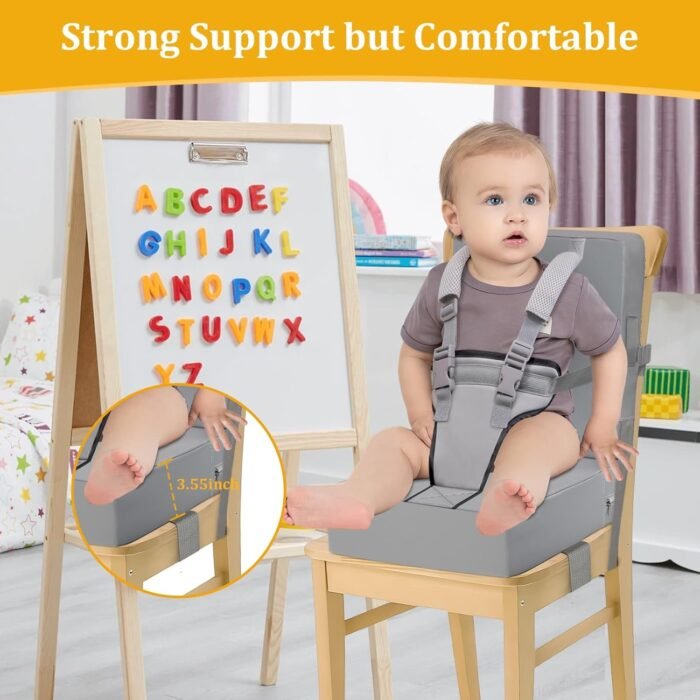 STRONG SUPPORT CHAIR BOOSTER SEAT: Booster seat for Dining Chair is filled with high-density 45D quality sponge (good materials, lime powder-free), which provides excellent support. If your table booster seat is too soft to lack support, sinkage and softening, our upgraded dining chair booster seat will meet your needs. Which brings comfort to your little kids while ensuring that it will not deform after long-term use. Booster seat for chair is dense and won’t leave a dent in it