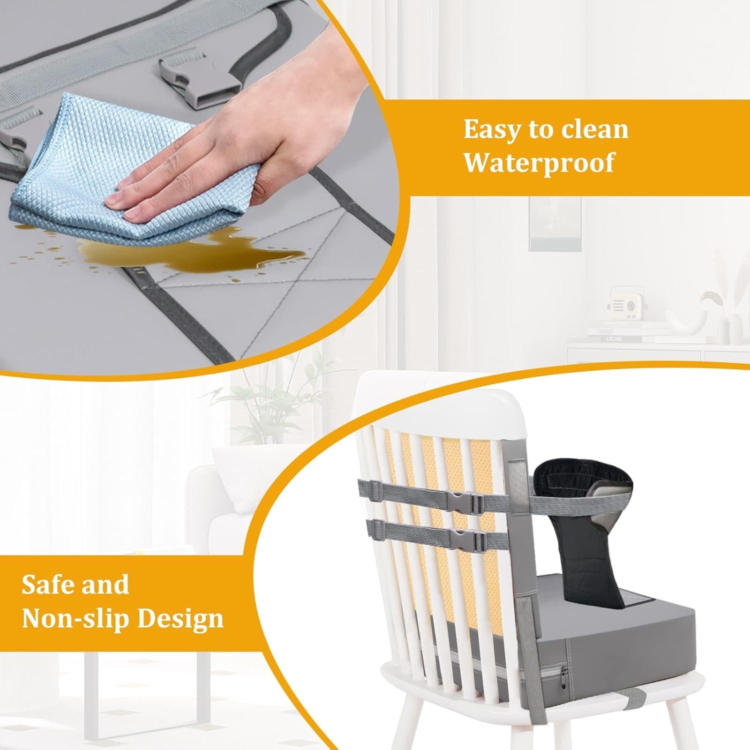 WATERPROOF & EASY CLEANING: Kids booster seat cover is made of PU leather which is waterproof and soft.It is inevitable that children will leave some stains on the chair booster seat when eating. The PU material with waterproof performance can easily wipe off the surface stains after simply wiping