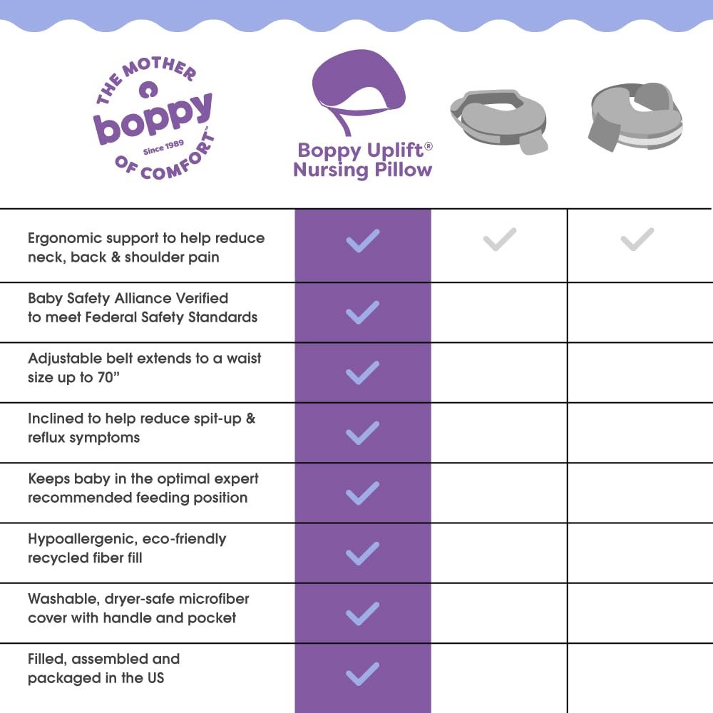 Time-Tested & Trusted: Boppy has supported parents and babies for over 35 years and is the first brand certified by the JPMA in the Nursing Pillow category for meeting the highest standards in safety, performance and quality; our Boppy Uplift baby feeding pillow is for adult-supervised awake time for feeding, not for sleep, and meets and exceeds standards for ASTM F3669 Consumer Safety Specification for Nursing Pillows and 16 CFR 1242 safety standard for nursing pillows, so you can have peace of mind