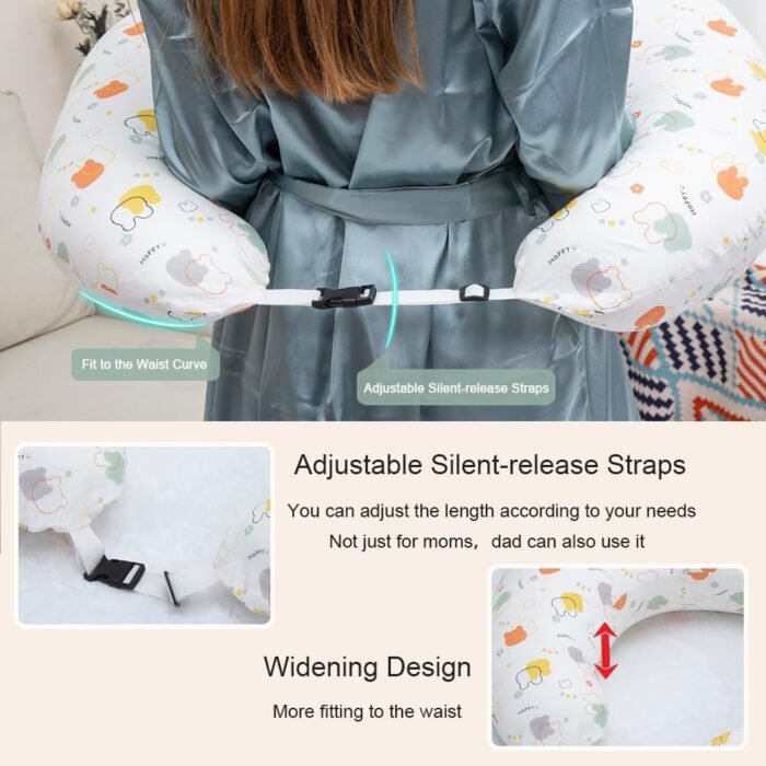 Innovative Design: This support pillow features a design that wraps around your waist and securely attaches to your body with adjustable silent-release straps. This design effectively helps mom and baby achieve and maintain the ideal position for latching and nursing