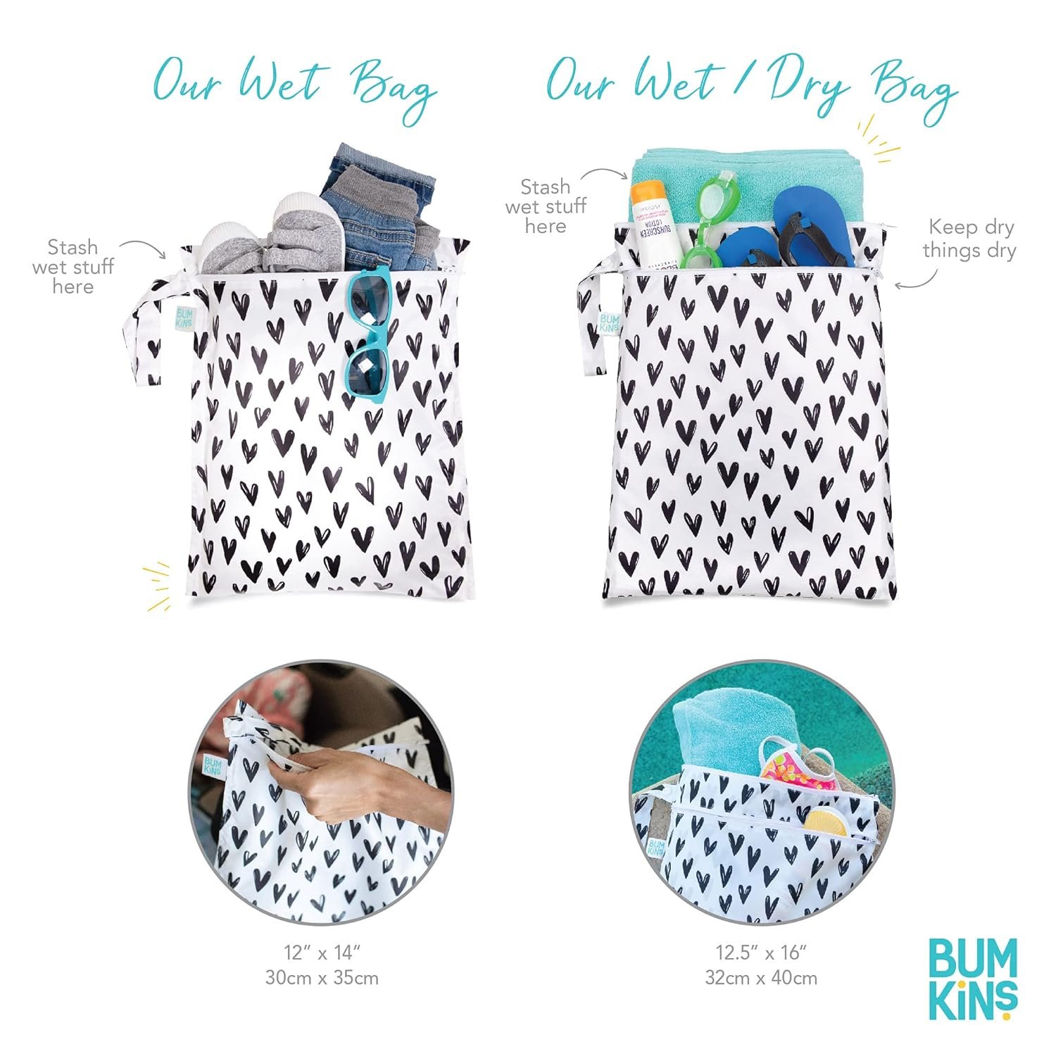LOTS OF USES – Not just for wet stuff – these bags make excellent organizers for storage and travel; with a snap handle, snap your bag wherever you need it – stroller, changing table or suitcase; packing for trips to beach, park, picnic, pool, camping