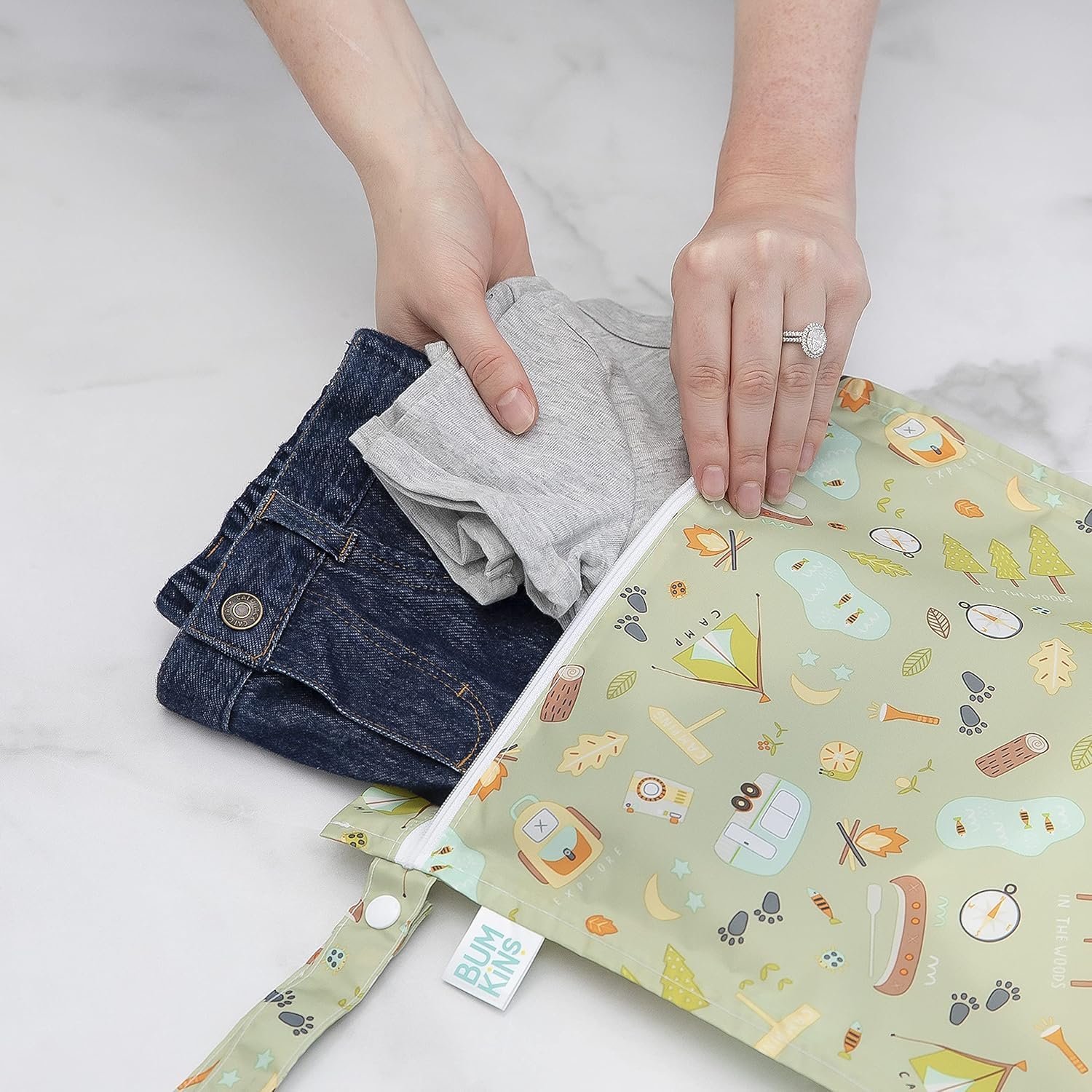 The better alternative to single-use plastic bags, our reusable wet bags are made from Bumkins’ signature easy-wipe waterproof fabric – 100% polyester embedded with TPU. Our bags feature heat-sealed seams for true waterproof protection. A smooth zipper closure locks away the mess. Wet bags are great for carrying diapers, dirty gym clothes and wet swimsuits. Not just for wet stuff – these bags make excellent organizers for toys, accessories, toiletries, electronics, travel and more! With a snap handle, snap your bag wherever you need it – stroller, changing table or suitcase. Measures 12″x14″. Fits approximately 6 cloth diapers. Bags are single compartment, non-gusseted, non-insulated and non-stretch. Designed in Arizona, responsibly made in China.