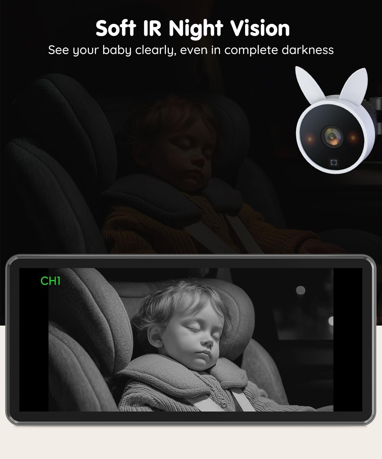 𝗜𝗥 𝗡𝗶𝗴𝗵𝘁 𝗩𝗶𝘀𝗶𝗼𝗻: Equipped with a low-light IR sensor, this baby camera for car for back seat ensures visibility even at night while being gentle on your baby’s eyes. Designed as a double car camera for 2 baby, it eliminates blurry night-time views and helps keep your kids safe throughout the night.