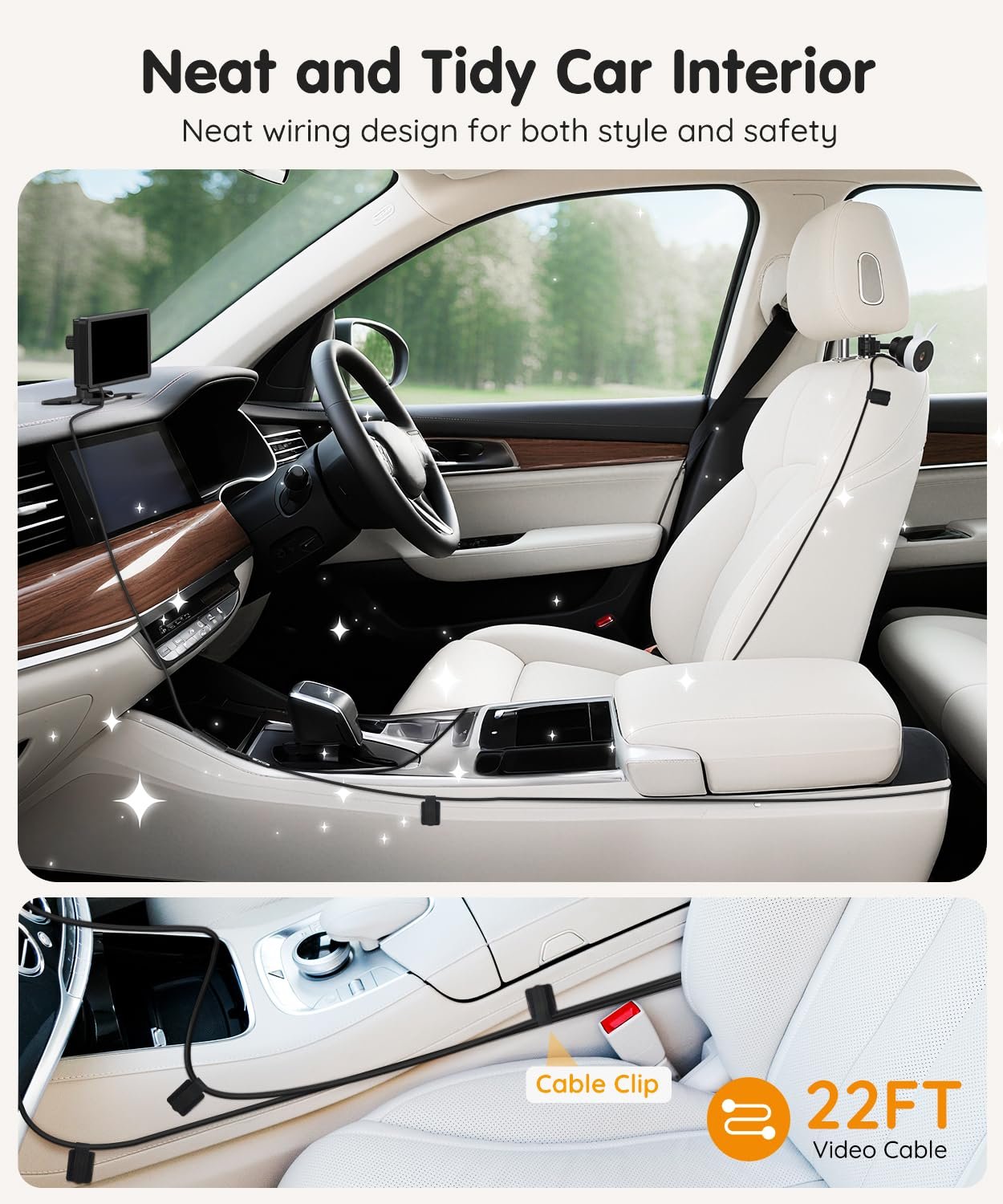 𝗘𝗮𝘀𝘆 𝗜𝗻𝘀𝘁𝗮𝗹𝗹𝗮𝘁𝗶𝗼𝗻: Set up this dual baby car camera in just 4 simple steps with a secure and stable mount. Included cable clips help organize cables neatly. The 22FT long cable makes this car baby monitor compatible with three-row vehicles, SUVs, and trucks, ensuring flexible and hassle-free installation.