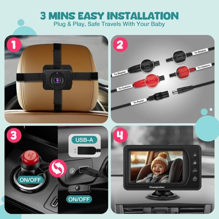 This baby car monitor with camera is designed for a hassle-free setup. With labeled installation guides and dual power options(USB or car charger), new parents can complete the installation in just 3 minutes. The customized HD video cable features pure copper wire and double-shielded treatment, ensuring a stable connection, reduced wiring time, and crystal-clear video transmission free from interference lag.