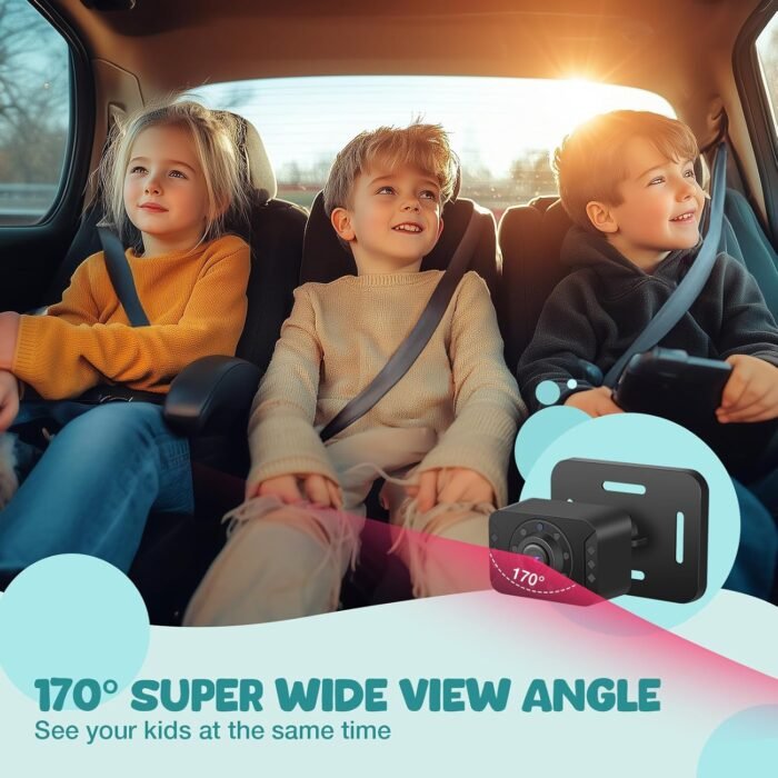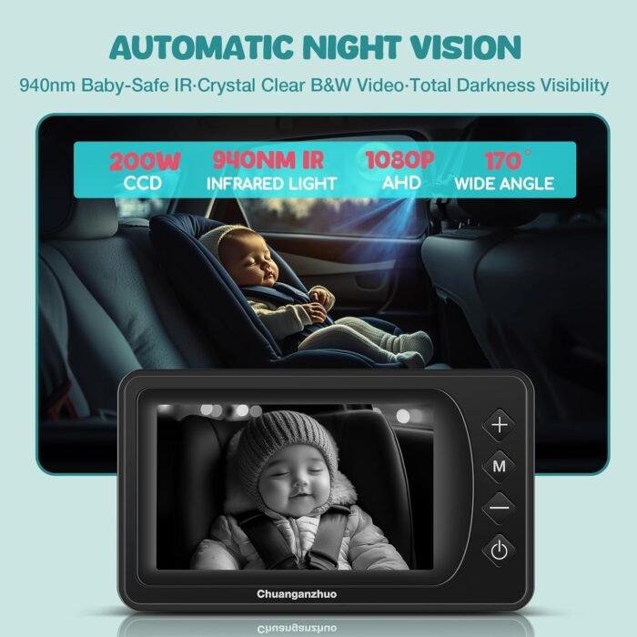 【5″ AHD 1080P IPS Full-View Monitor】The 5-inch perfect size: bigger view than 4.3″, neater than 7”. Our IPS full-view car baby monitor delivers clear, accurate images from any angle. Whether you’re in the driver’s or passenger seat, you’ll enjoy an identical viewing experience. This AHD 1080P monitor with high pixel density precisely reproduces colors and contrasts, offering rich gradations, sharp light-dark differentiation, and vivid images to capture your baby’s every movement