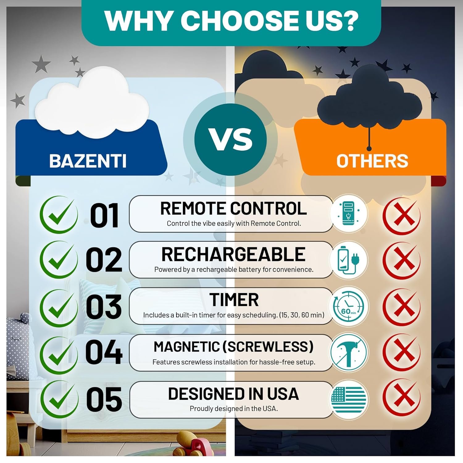 USB RECHARGEABLE : This cloud hanging lamp is a durable baby lamp perfect for room decor. Its cordless, USB-rechargeable design replaces battery operated lights, making it ideal for bedroom decor.