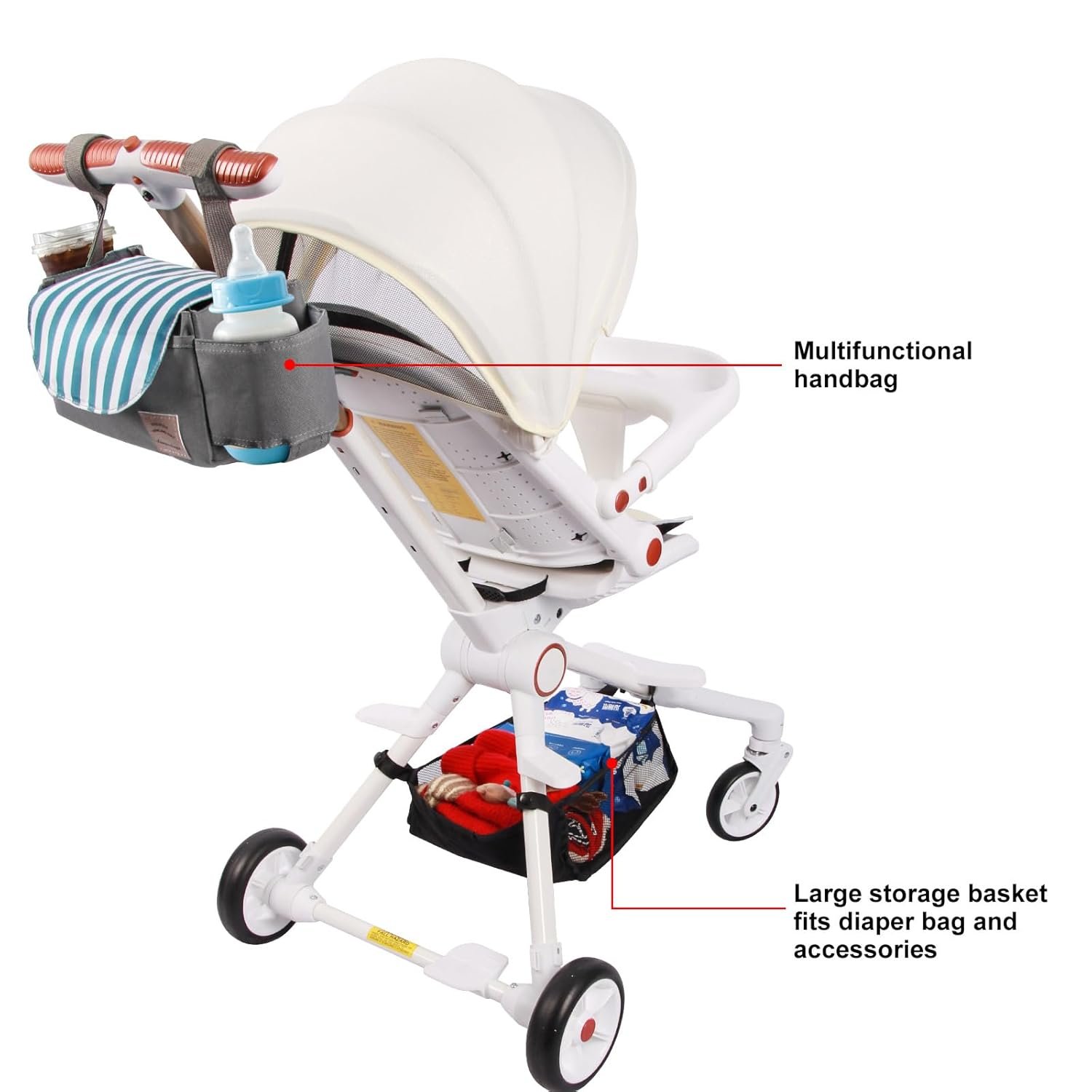 Unbelievable! Not only does this travel stroller have a removable under-seat storage pouch, but it also comes with a detachable multi-functional handlebar bag. This is pure genius! It frees up your hands when out and about with baby.