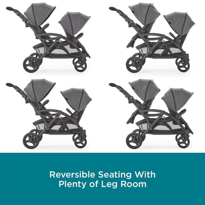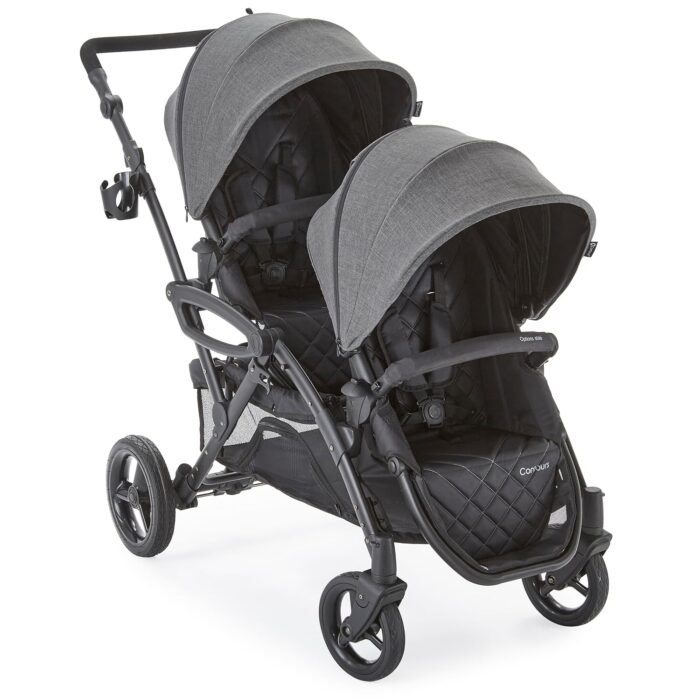 Now even better! The Contours options Elite V2 double stroller features all the great features that parents love including reversible seats, one-hand reclining seats, adjustable leg rests, zippered extensions on both canopies, extra-large storage basket and a parent cupholder. Plus a few new great features like the height-adjustable handle, quilted seats, and an improved Easy-Lift seat design to make it even easier to reverse the seats while on the go. Enjoy the convenience of versatile seating configurations to keep everyone happy. Compatible with two infant car seats (car seats and adapters sold separately) This tandem stroller makes it easy to transport your twins, and when they get older, The stadium-style seating makes it easier for both to see the sights, with plenty of room between the seats for little legs. This double stroller truly has it all! Disney-size approved (any seating configuration) as long as the parent handle is in the uppermost position.