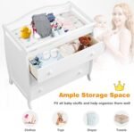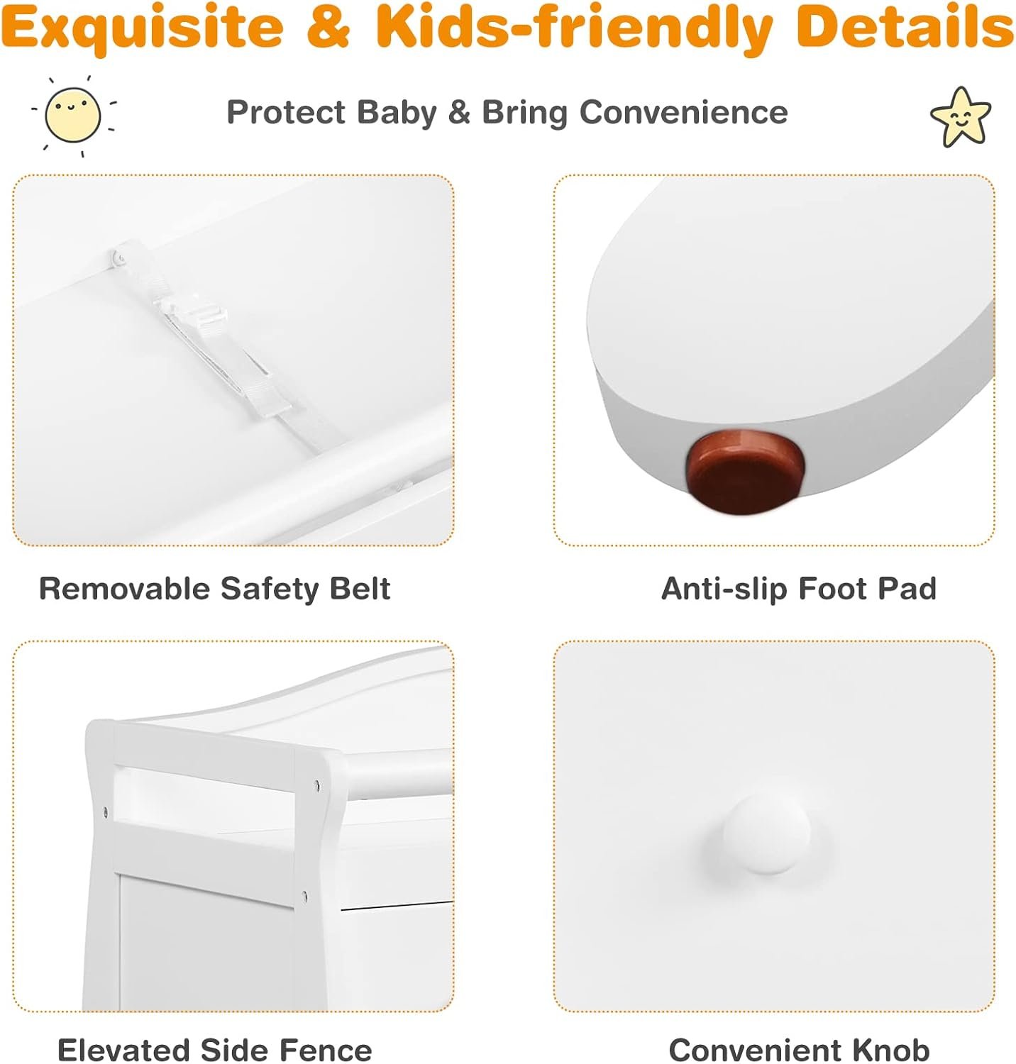 Safe & Stable Construction: The changing table dresser is strongly supported by four sturdy legs and the changing top can hold up to 176 lbs. Each leg is equipped with anti-slip foot pad to avoid slipping and wobbling. Plus, safety belt and raised rails will help protect your baby from falling.