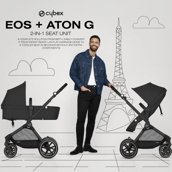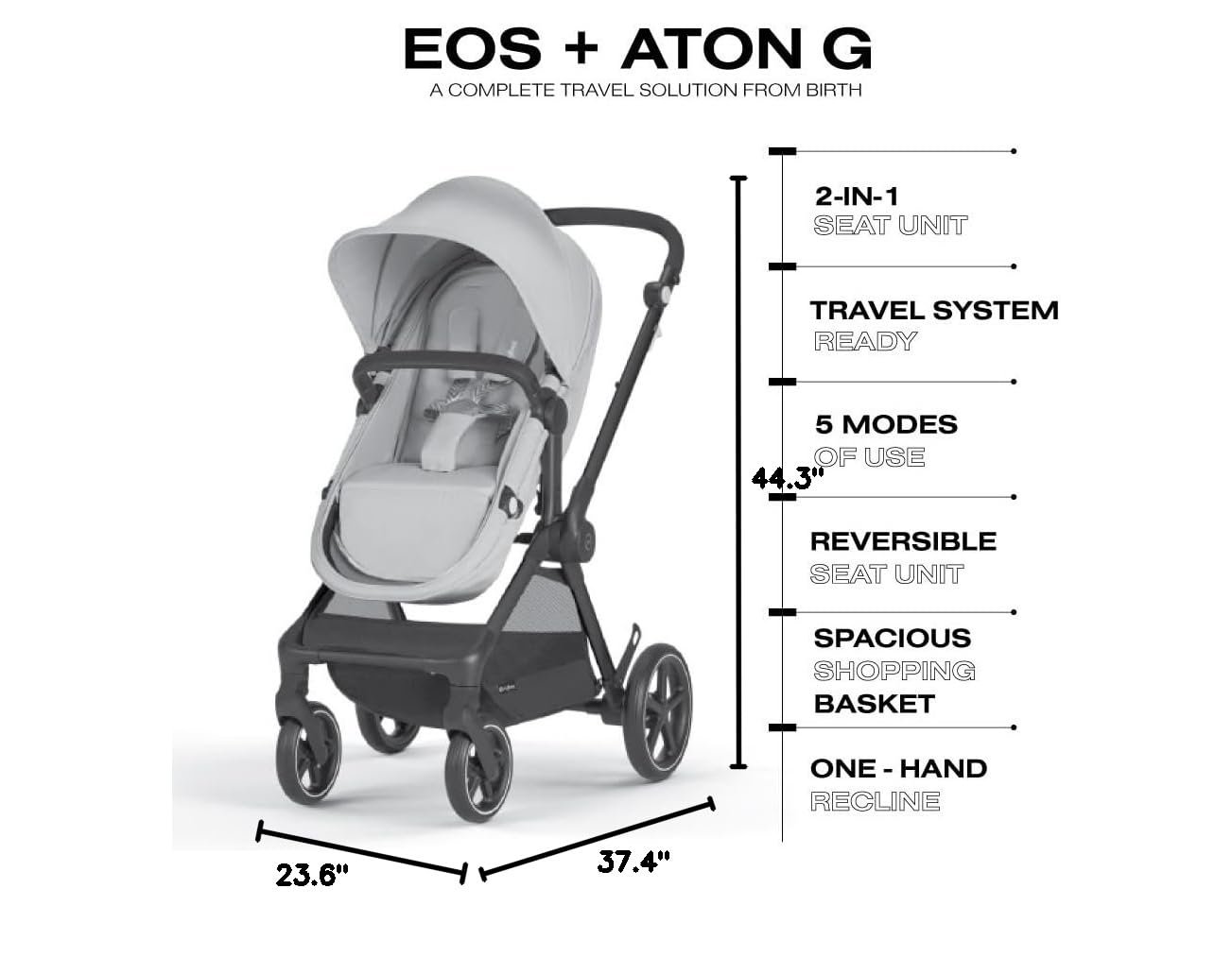 The CYBEX EOS Stroller + Aton G Infant Car Seat is a perfectly streamlined Travel System for your growing family. A complete travel solution from birth, it features a 2-in-1 seat unit that easily converts from lay flat “carriage mode” for your newborn to a reversible toddler seat when your child grows bigger – no extra components or accessories required. Additionally, you can use the included adapters to attach the Aton G Infant Car Seat to create the ideal travel system–complete with advanced safety features, all-terrain wheels, front wheel suspension and an oversized shopping basket. With this versatile frame, the transition from drive to stroll is child’s play!