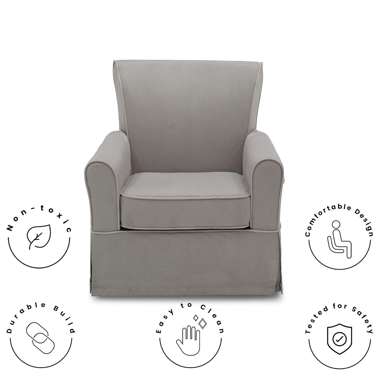 A plush armchair with a supportive back above a gentle swivel and glide mechanism creates a glider you and your baby will love to relax in. Crafted with a sturdy wood frame for lasting strength, the Benbridge Nursery Glider Swivel Rocker Chair from Delta Children is upholstered in easy-to-clean, super-soft microfiber, and will work well in any other room in the house after your little one has outgrown the nursery.
