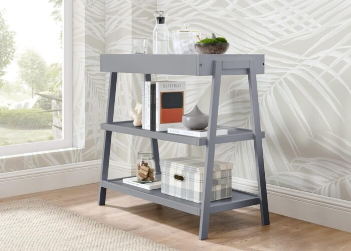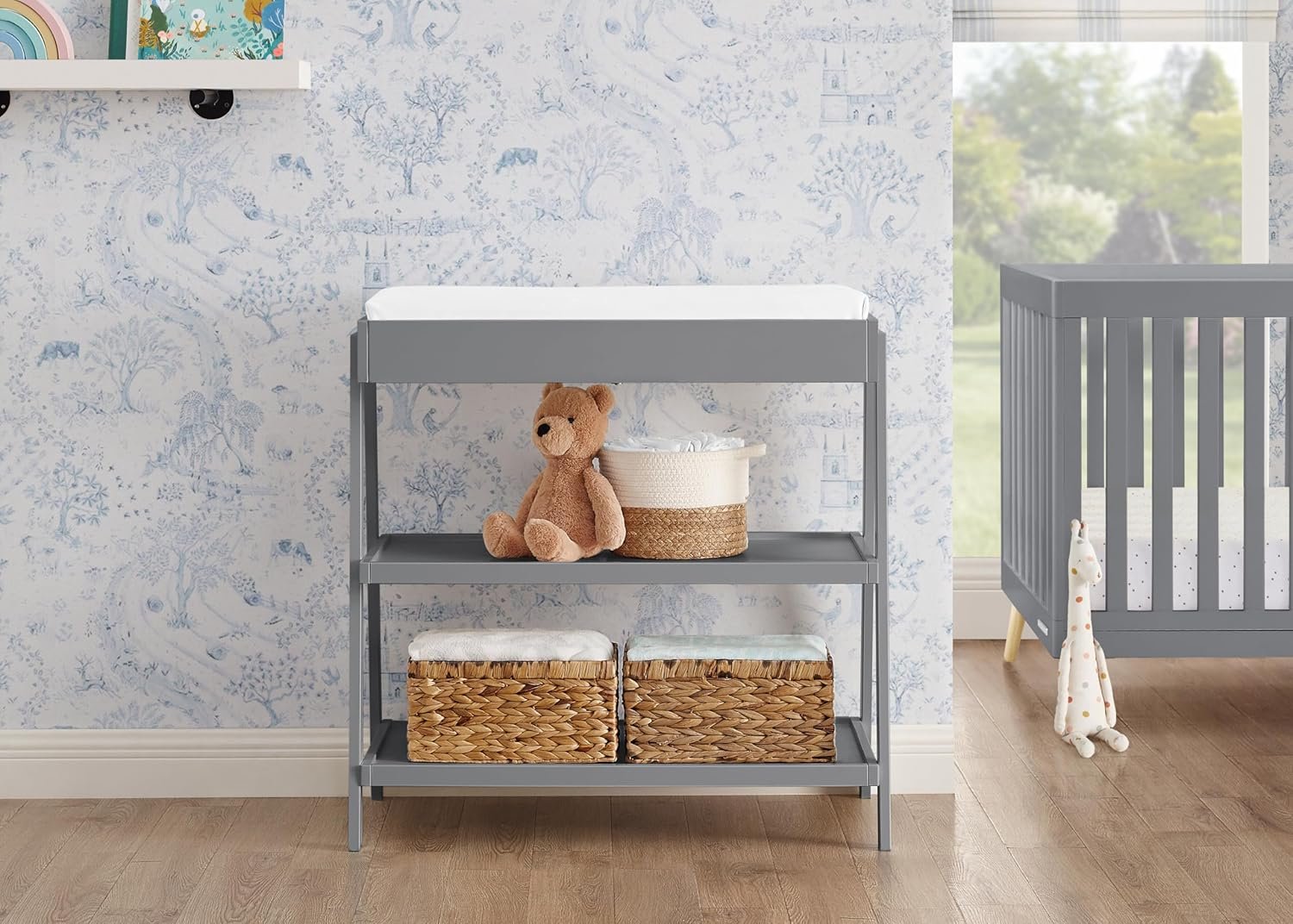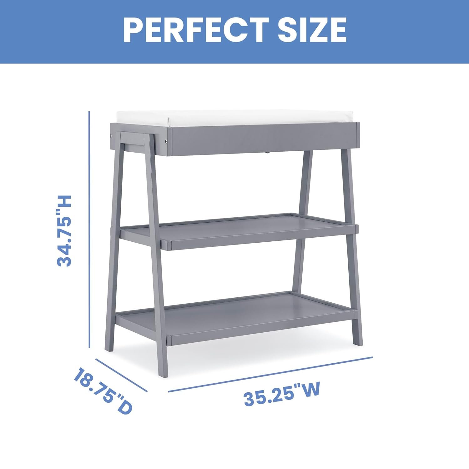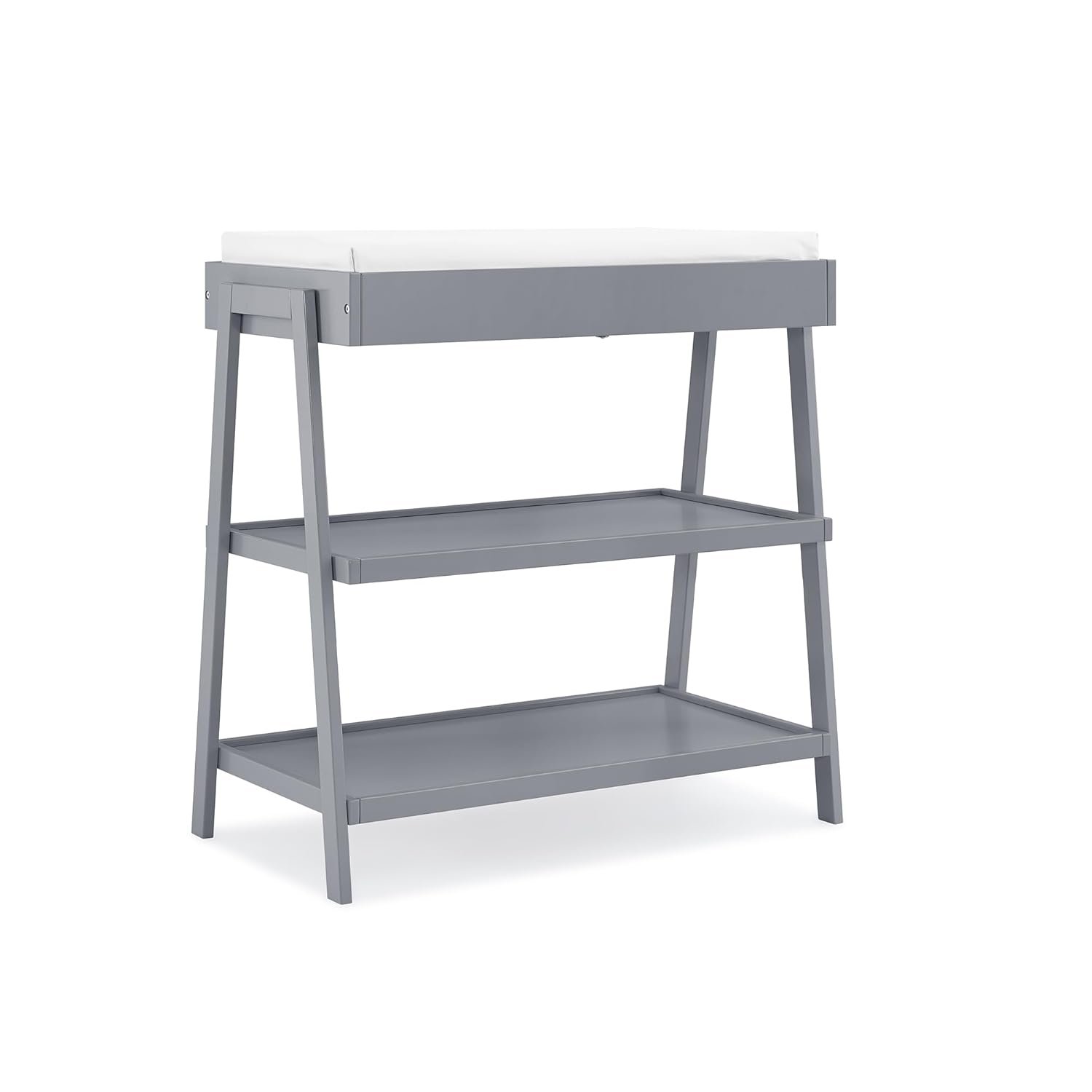 The Scout Changing Table by Delta Children is a must-have for your nursery. The contemporary design of this changing table goes with any style. Crafted with two open shelves, this changing table makes it easy to store (and grab) diapers, wipes and other essentials. A standout piece for years to come, this changing table can also be used as a storage piece or bar cart later on. Plus, this changing table is GREENGUARD Gold Certified, which means it’s built to contribute to cleaner air for a healthy home. Pair this changing table any Delta Children crib in the same finish for a complete nursery. Changing pad sold separately.