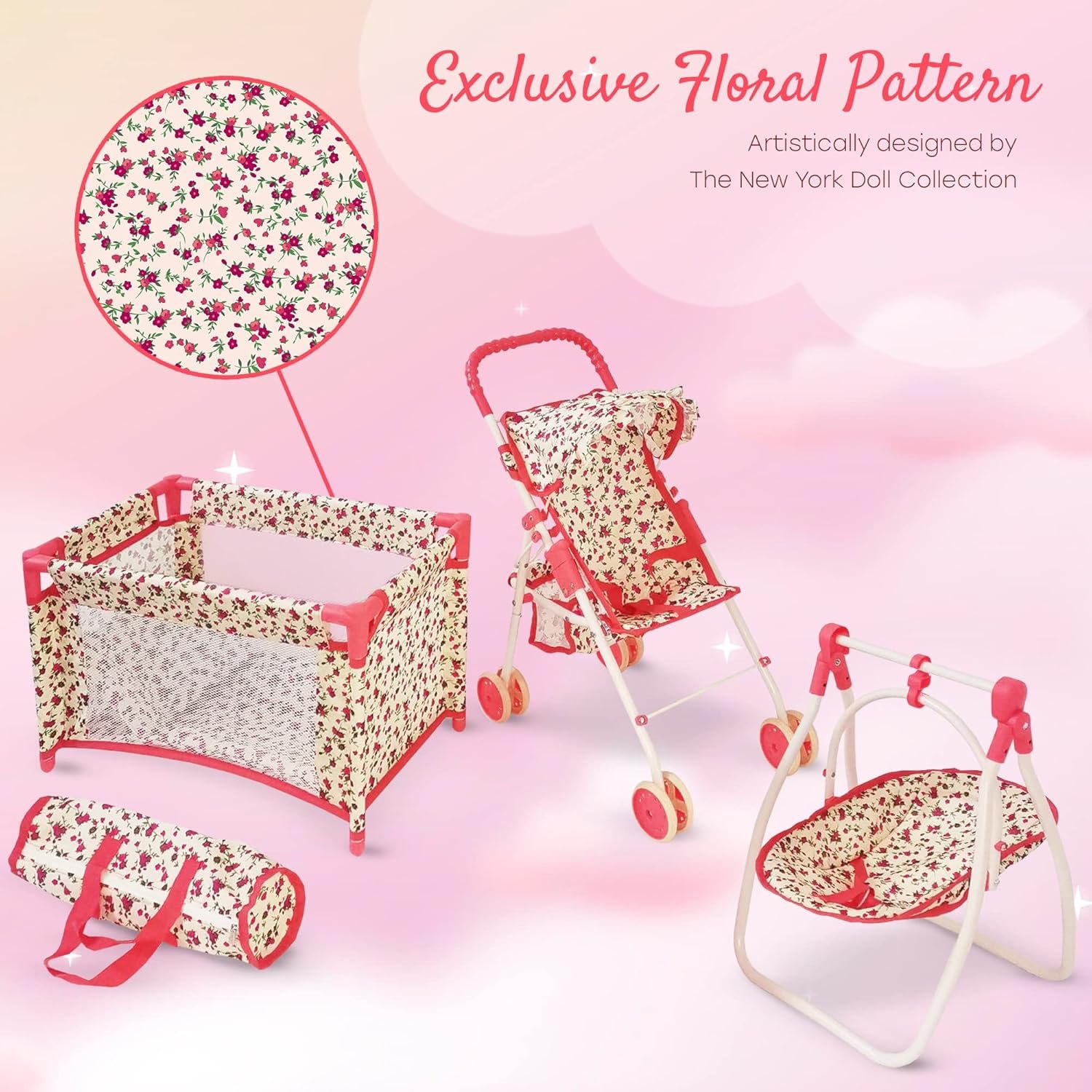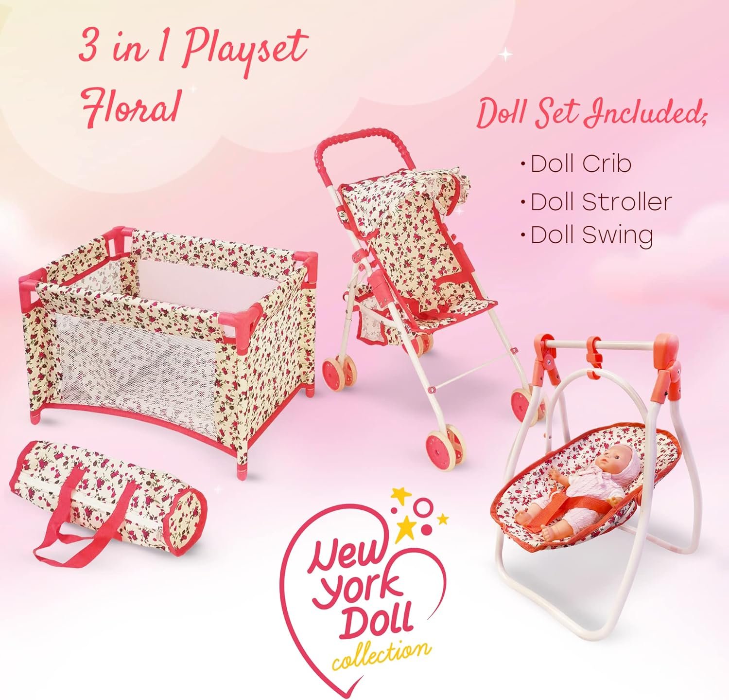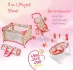 BABY DOLL ACCESSORY SET: Our 3-in-1 baby doll stroller and crib set includes 3 must-have accessories for baby dolls! The babydoll crib play set comes with a babydoll stroller, a doll swing and pack n’ play doll baby crib that doubles as a babydoll bed for quick naps or overnight.