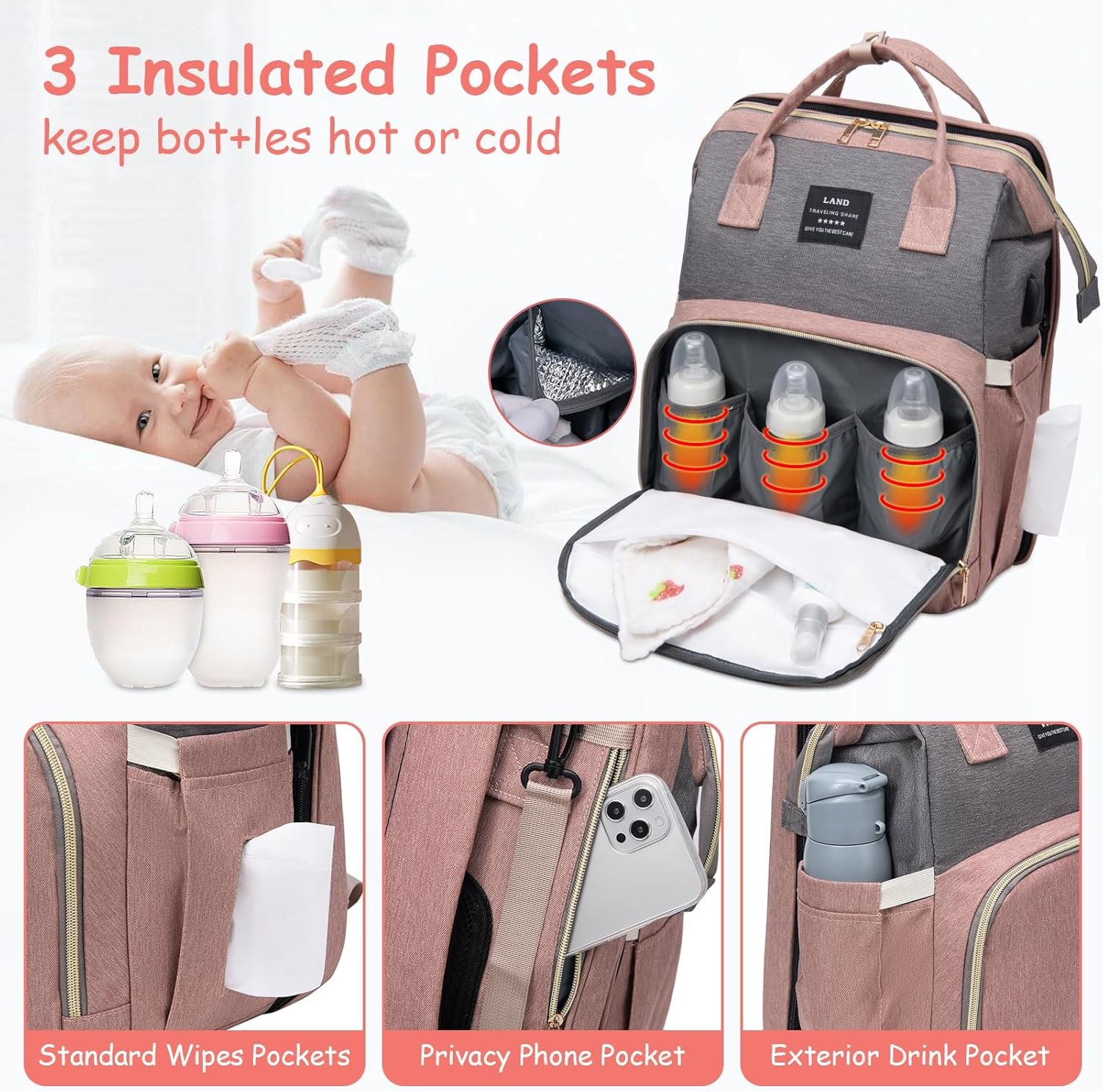 【Multi-Modal Carry】: Transition with ease from a sleek diaper backpack to a portable changing station or even to a snug baby crib. With stroller-compatible straps, this bag is the perfect companion for travel, shopping, or day-to-day errands, ensuring everything you need is accessible and secure.