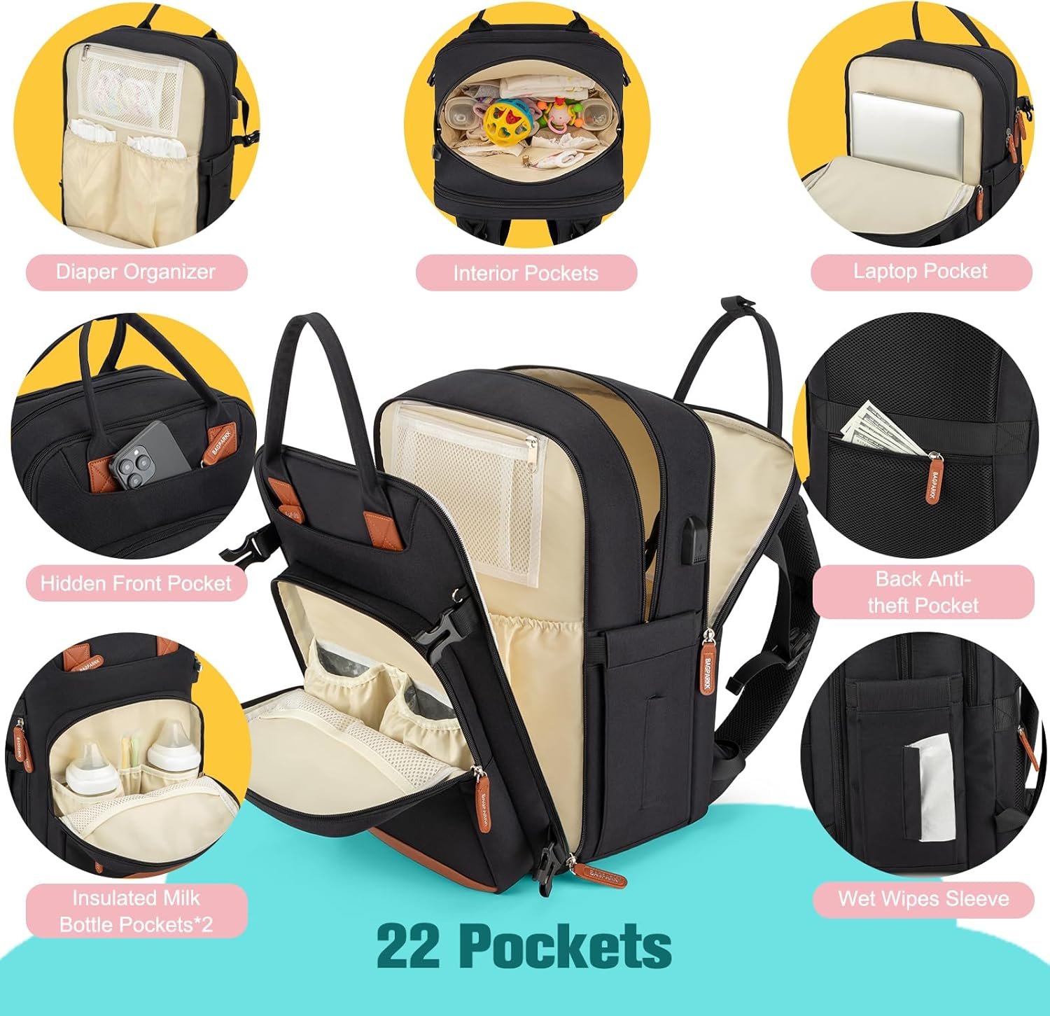 Versatile& Convenient:Baby diaper bag features USB charging port and built-in charging cable(Please note that this backpack does not include the power bank itself),back anti-theft pocket, and 15.6″ padding laptop pocket for carrying work laptop;Two side pockets for paper towels and water bottles