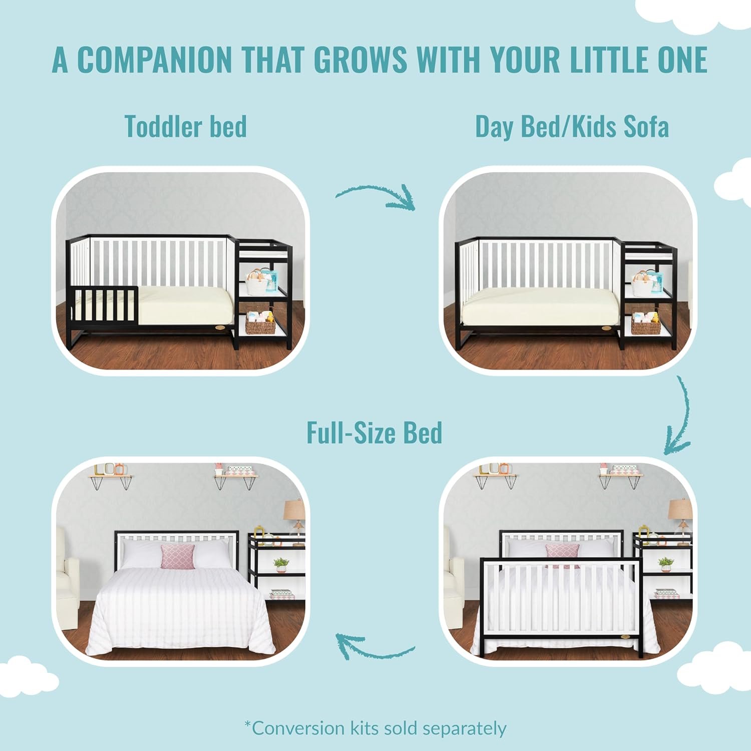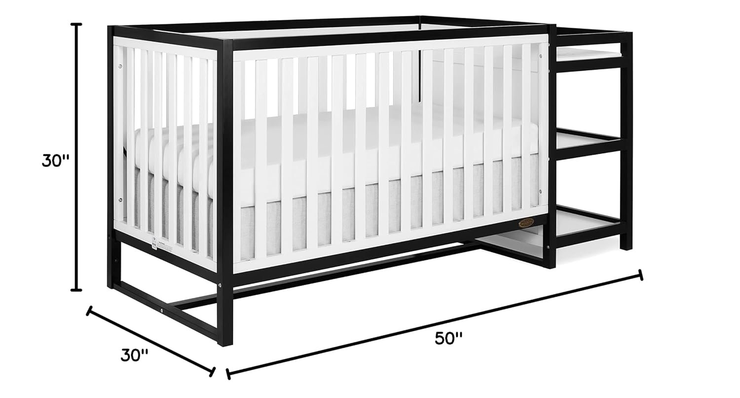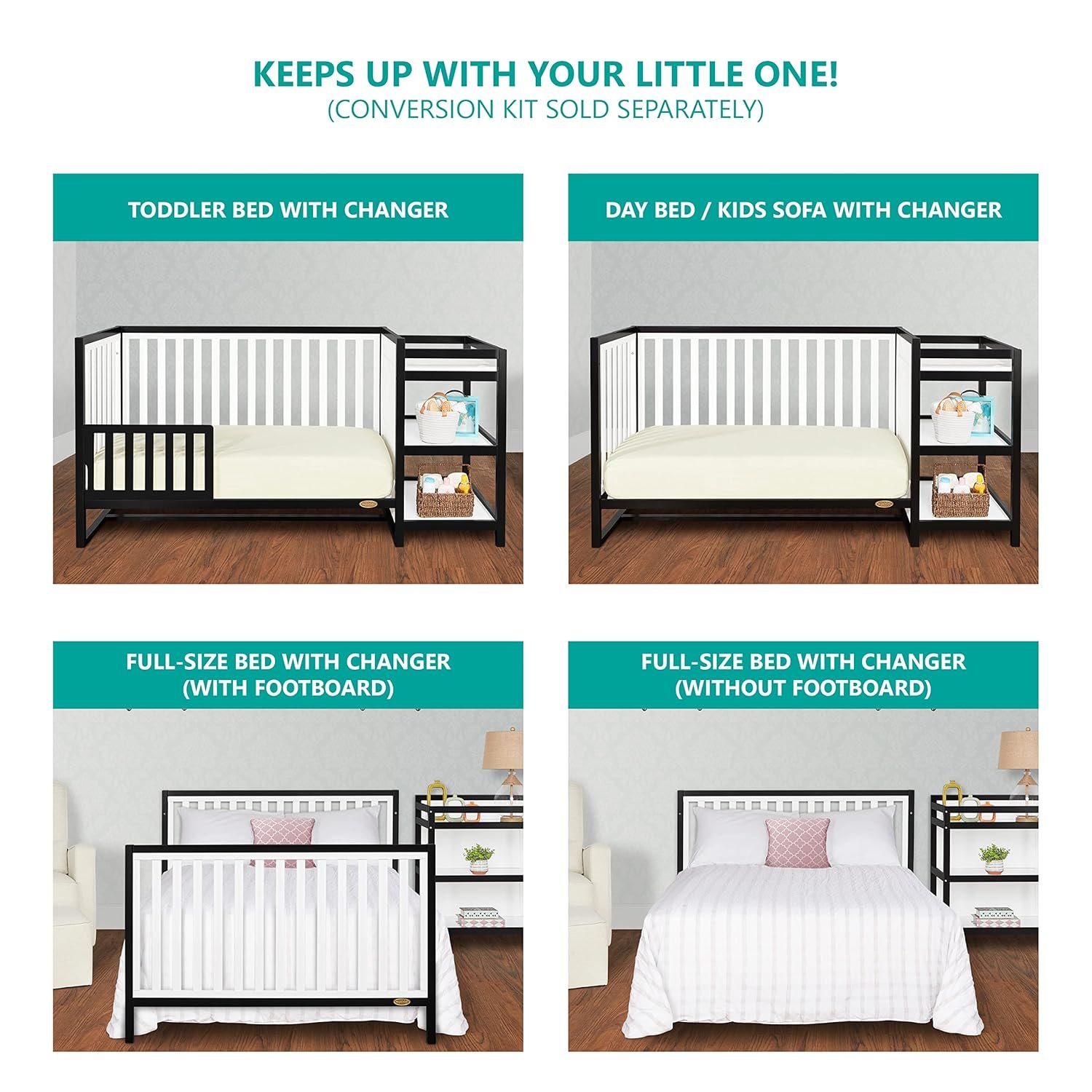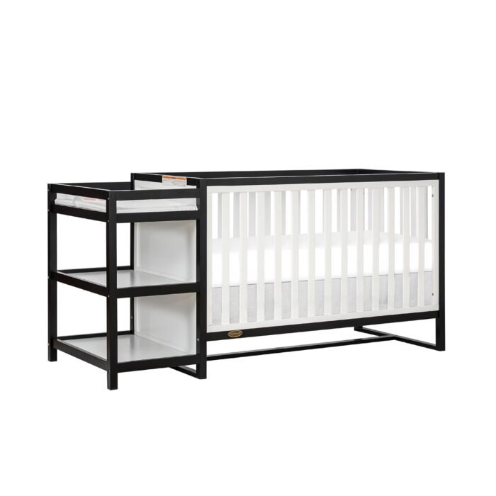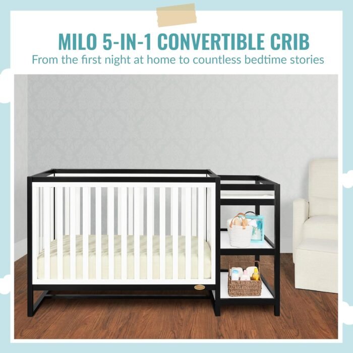 The Dream On Me Milo 5-in-1 Convertible Crib and Changing Table is the perfect blend of fashion and function, bringing together contemporary design with abundant features and a focus on safety. The Milo comes with an attached changing station that makes it a compact, all-nursery solution. Clean, straight lines and a gender-neutral form help you create a contemporary space and a unique base creates a floating feel. This Milo is designed to grow with your baby! It converts from a crib to toddler bed, toddler bed rail sold separately) a daybed and full-size bed (full-size bed frame and mattress not included). It also comes with a 3-position adjustable mattress support system. The attached changer comes with a 1″ thick mattress pad and safety belt giving you and your baby a comfortable and safe space for diaper changing. The two open shelves provide ample space for organizing and storing diapers, wipes, burp cloths and all baby essentials. Safety and durability are never a concern with the Milo 5-in-1 Convertible Crib. It is built to last, made out of sustainable, renewable, sturdy New Zealand pine wood. All our cribs are JPMA certified to meet/exceed CPSC/ASTM safety standards. Our products are tested by 3rd party labs for lead/other toxic elements to meet/exceed CPSC/ASTM safety standards. The Milo comes in four beautiful single and dual-toned, non-toxic, child-safe, water-based finishes that allow you to create the nursery of your dreams – contemporary, whimsical, fairy, vintage – let your imagination reign supreme! This is a standard full-size crib and measures 71.26L x 29.55W x 35.5H inches and weighs 60 lbs. For the best fit, we recommend any Dream On Me or Evolur full-size, non-toxic, Greenguard certified mattress.