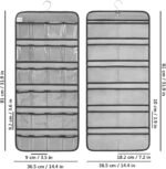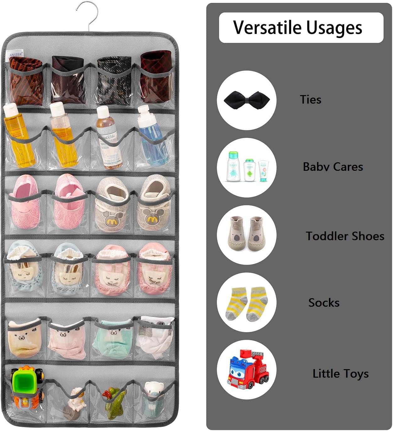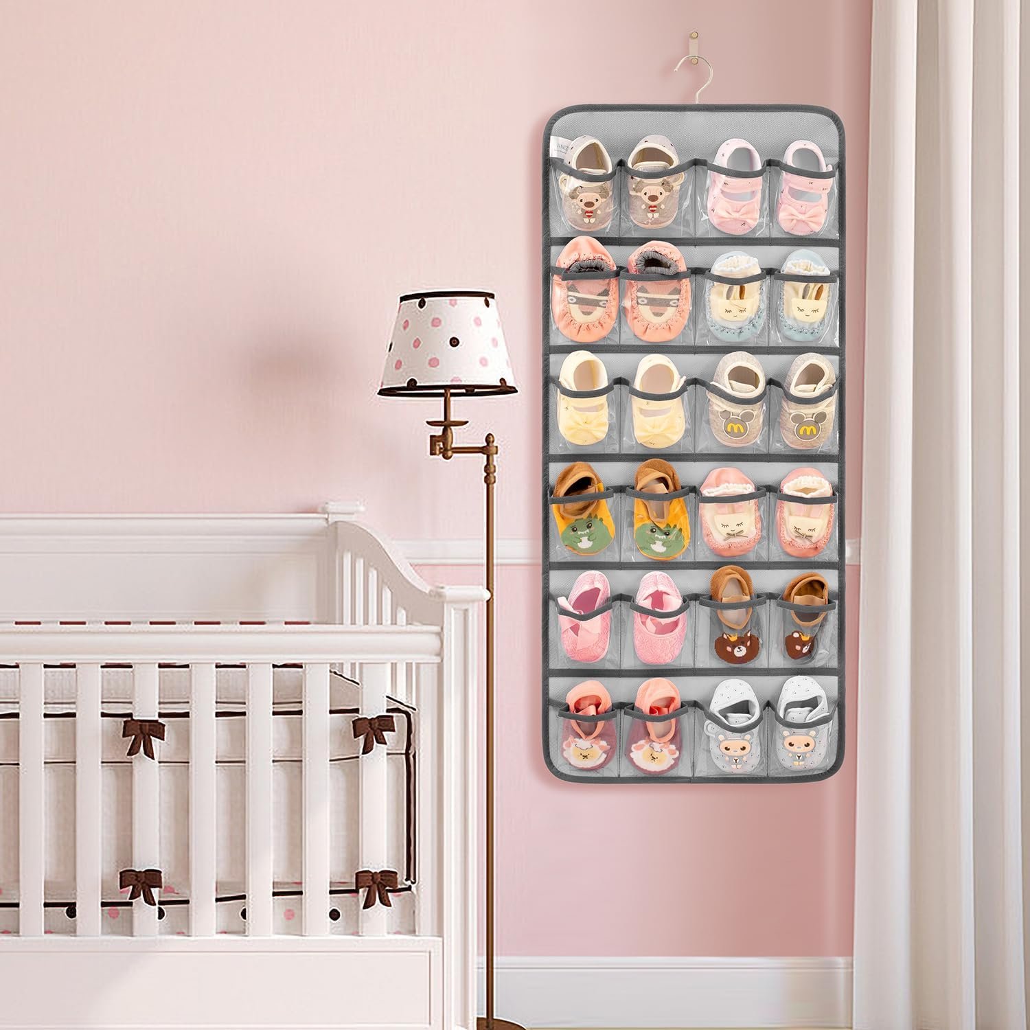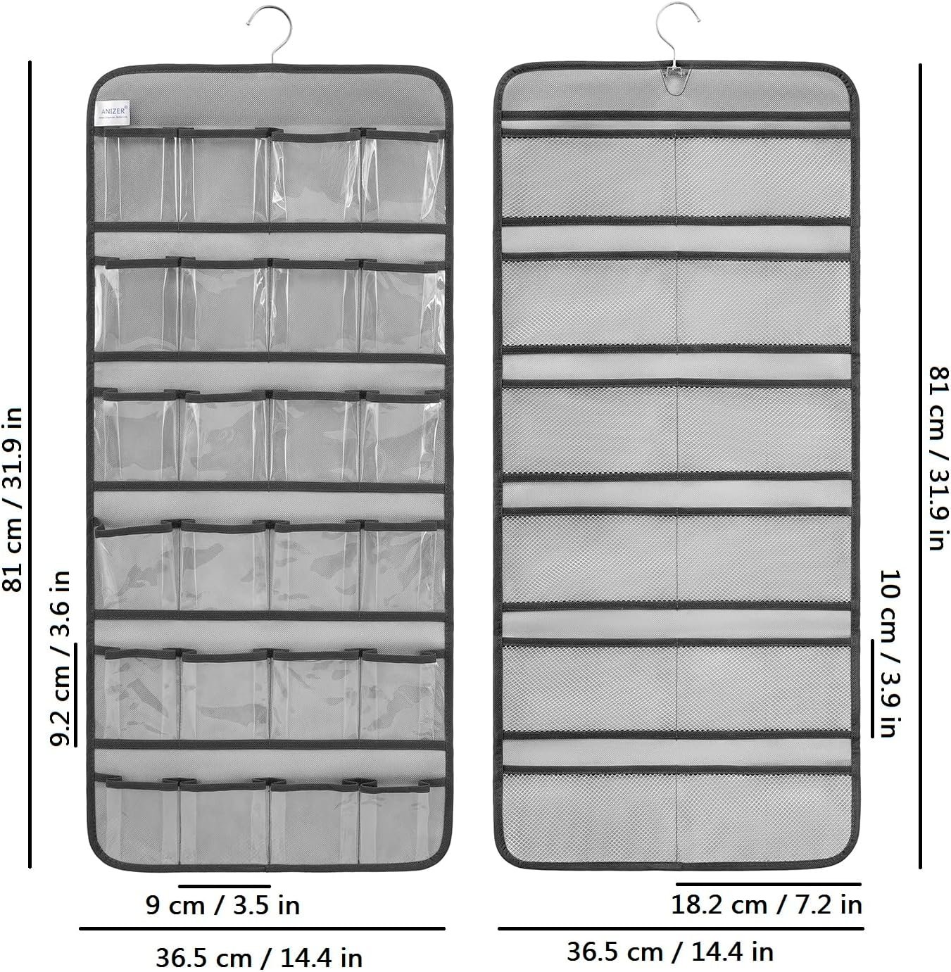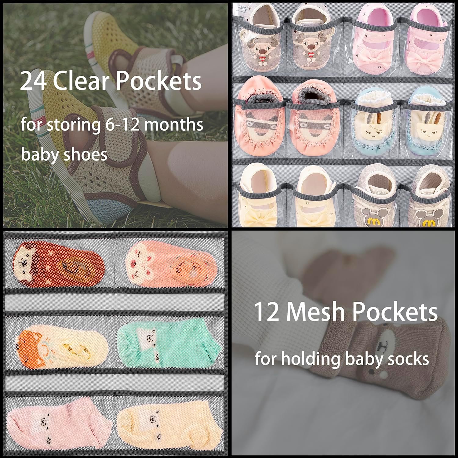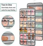 Double sided hanging infant shoe organizer with 31.9″ height and 14.4″ width. Front side has 24 clear pockets with 3.6″ D x 3.5″ W inch, design to hold 6-12 months toddlers’ shoes, up to 12 pairs. Back side has 12 mesh pockets with 3.9″ D x 7.2″ W inch, design to hold kids socks, up to 12 pairs. Please be aware that the pocket size is only suitable for baby shoes, not avaiable for adults’ shoes.