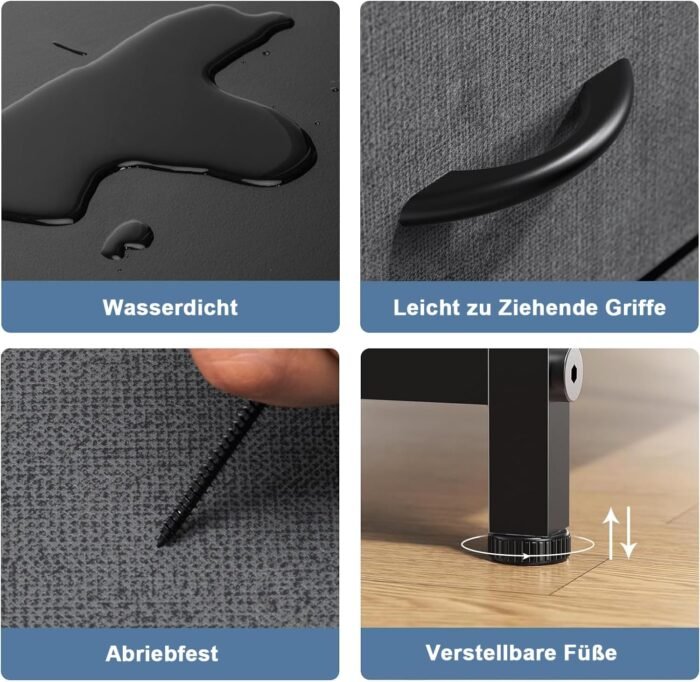 Sturdy & Stable: This dresser is built with a sturdy metal frame to ensure stability. It is equipped with 4 adjustable feet to safeguard your floor from scratches, and you can effortlessly balance the dresser in tight spaces. Moreover, it comes with an anti-tilt device that can be utilized when mounting the dresser to the wall, preventing accidents caused by uneven floors or climbing.