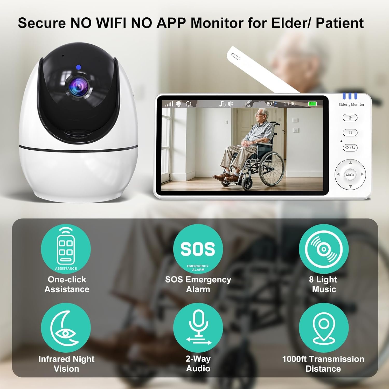 Elderly Monitors: this elderly monitor is designed for the elderly and includes the following features: Medicine feeding reminder, SOS alert, roll over alert, toilet alert, drink water alert , 2-Way audio, infrared night vision, VOX, 8 Lullabies, temperature alarm,1000ft Range. Ideal for elderly, seniors, patients, disabled.
