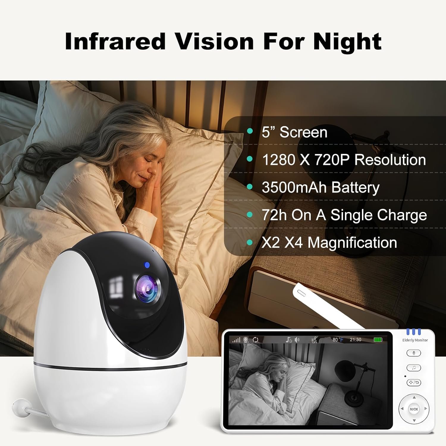About The Screen : the screen is 5″ and the resolution is 1280*720 P. The infrared night vision function allows you to see the elderly at night. The screen battery capacity is 3500mAh, a charge can be used for 72 hours.