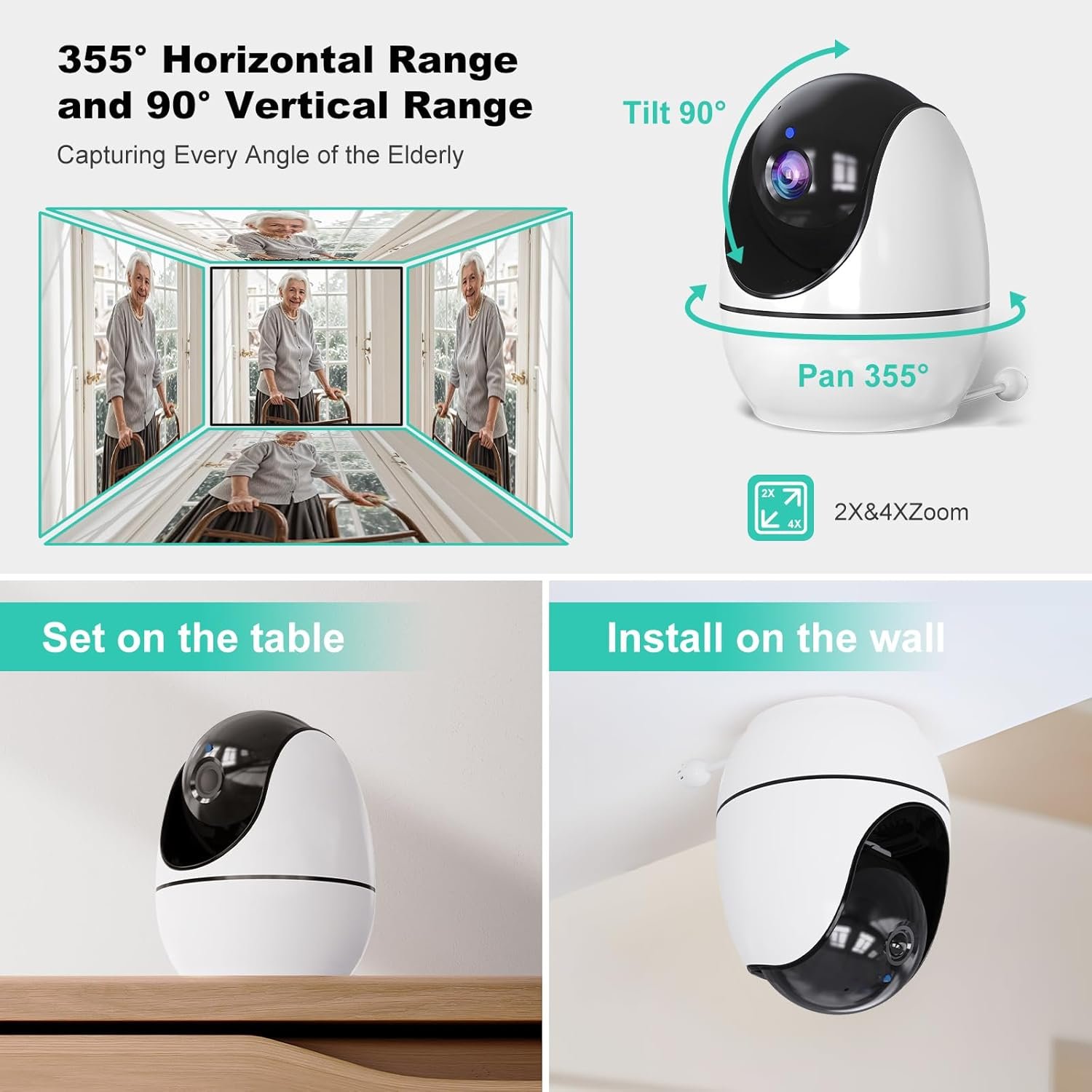 the camera’s 355° horizontal range and 90° vertical range allow you to keep an eye on a wider field of view. You can place the camera on the desktop or attach it to the wall with screws according to your needs.