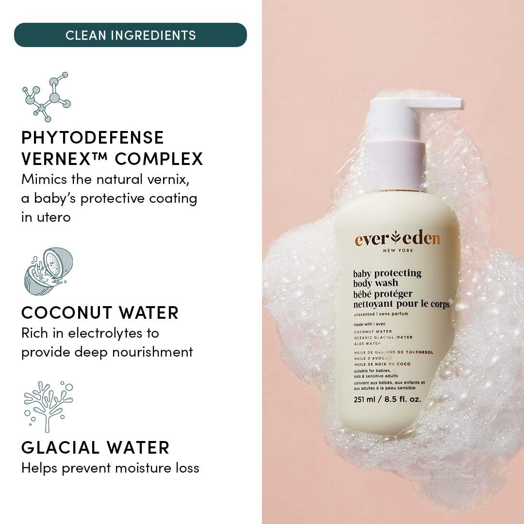 CLEAN INGREDIENTS: Evereden Clean Baby Wash is formulated with ceramides, squalane, and seaberry seed oil to lock in moisture while comforting baby’s skin.
