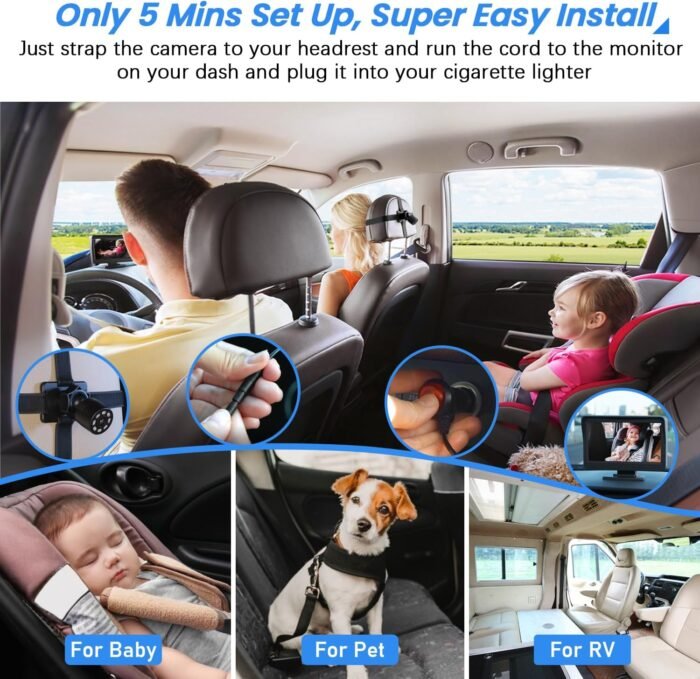 Easy Installation in 5 Mins: No tools needed, the baby car mirror can be installed in minutes. Just strap baby car camera to headrest, connect the video cable to baby car monitor on the dashboard and plug into cigarette lighter. The 12V cigarette lighter suits for most cars, trucks, vans SUVs.
