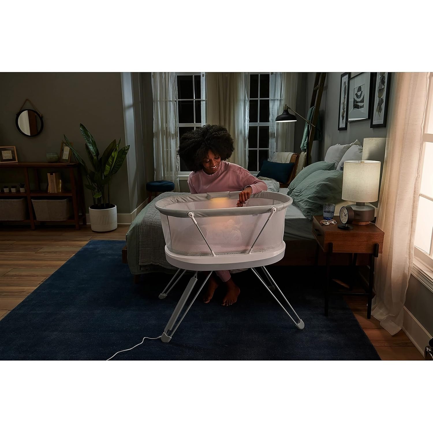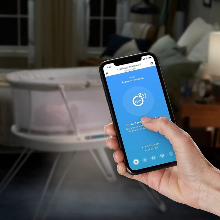 The Fisher-Price Luminate Bassinet is a customizable bedside crib that can help your newborn fall asleep with a variety of calming features you can control from your smart device. The built-in Smart Sensing System can detect your baby’s cries and respond with music and vibrations to help soothe them back to sleep. This baby bassinet also features a crib light and motion-activated floor light to illuminate your path for nighttime check-ins, plus breezy mesh sides. (Max. weight 20 lb/9 kg) Use only with a child who is unable to push up on hands and knees, pull up or sit unassisted.