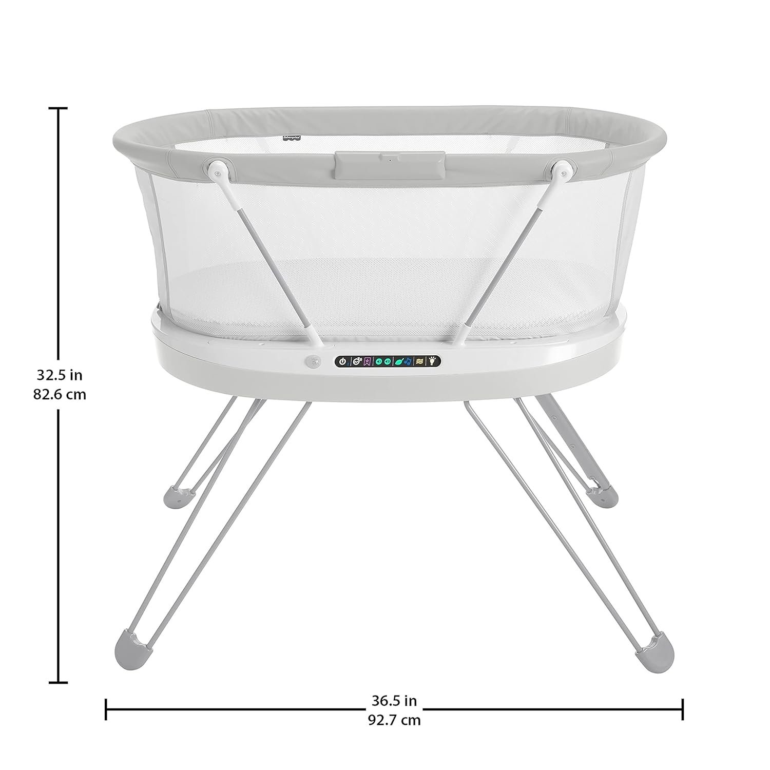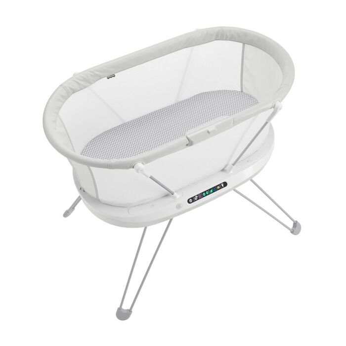 Stationary bedside bassinet with built-in sound detection and customizable lights, music, white noise and vibrations controllable from a smart device with the free Smart Connect app
