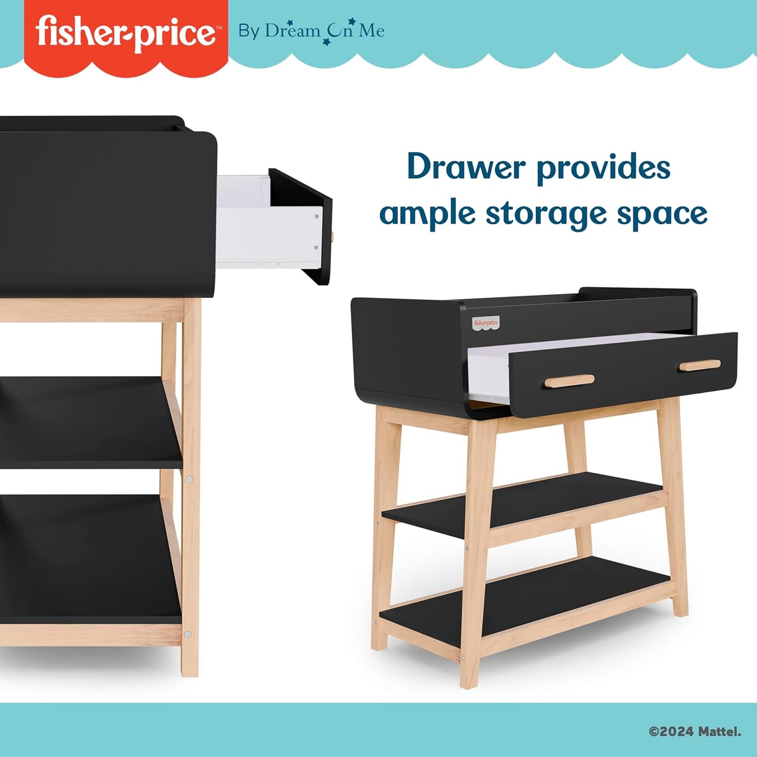 Say goodbye to diaper changing woes and hello to convenience with the Fisher-Price™ Iris/Siesta Changing Table by Dream On Me! Made from durable New Zealand Pine Wood, this changing table is not only sturdy but also easy to maintain. The bottom closed drawer and two open shelves provide ample storage space for all your diapering essentials and more, keeping everything organized and within reach. Safety and functionality are at the heart of our design. The changing table is JPMA & Greenguard Gold certified and meets/exceeds the ASTM & CPSC safety standards. Available in four pleasant variations – Blush Pink, Light Grey, Matte Black Vintage Oak, and Vintage White Oak – each option is carefully crafted to suit your style preferences and nursery décor. Product dimensions are 33.9″L x 18.5″W x 38.4″H, with a weight of 66 Lbs.