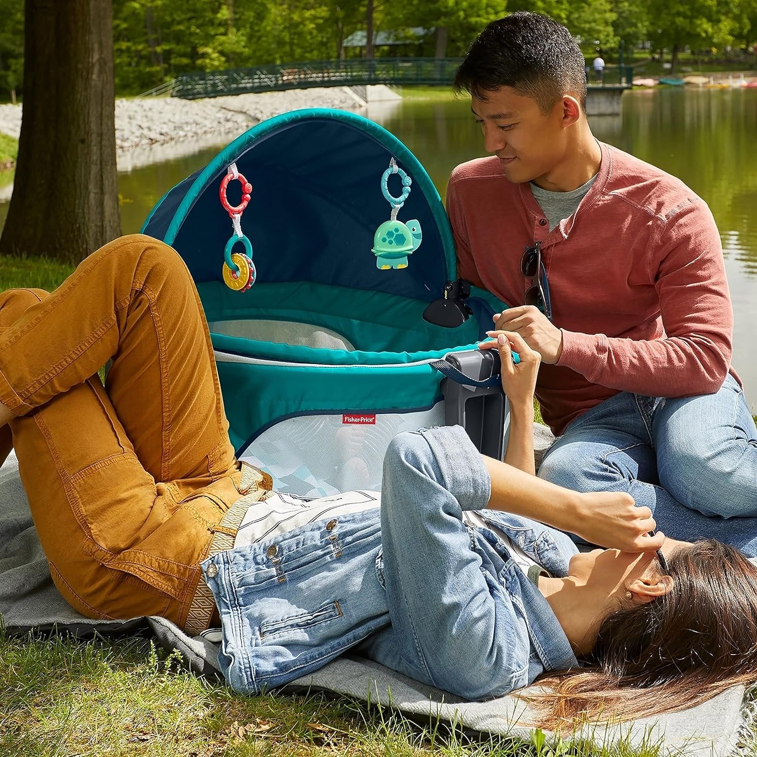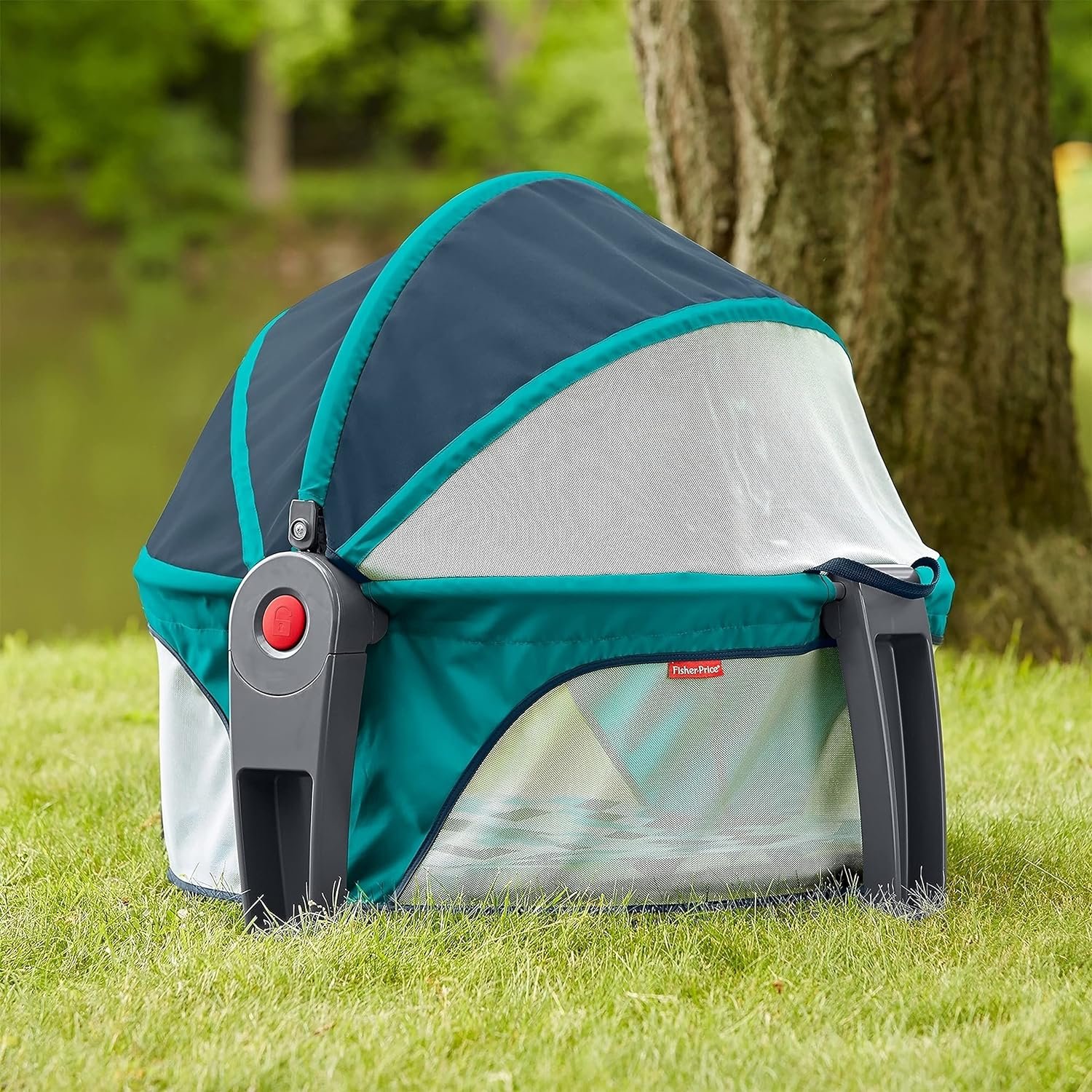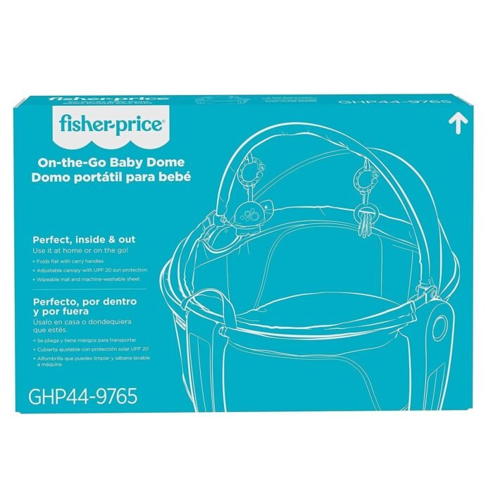 Your new tiny human will feel right at home wherever you go in the Fisher-Price On-the-Go Baby Dome. This cozy, portable play space features a comfy pad for your baby to nap or play on, a canopy that protects against the sun’s bright rays, and insect-protective netting. Two colorful toys dangle overhead, which can be removed and placed within your baby’s reach for tummy-time play. And when you’re heading out with your favorite copilot, the dome folds easily for storage and travel! Where development comes into play Security & Happiness: The dome’s soft padding and sun-blocking canopy help your baby feel secure when away from home. Sensory: The linkable toys overhead grab your baby’s attention and encourage eye tracking. Fine Motor Skills: Move the toys within your baby’s reach and watch those little hands grasp and explore all the fun textures, helping to strengthen their dexterity. Use only with a child who is unable to push up on hands and knees, sit up unassisted, or grasp side and pull upward.