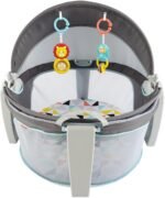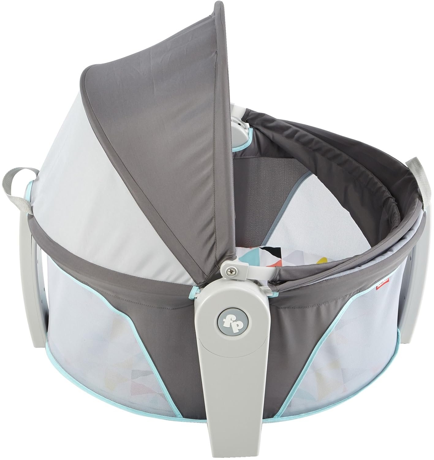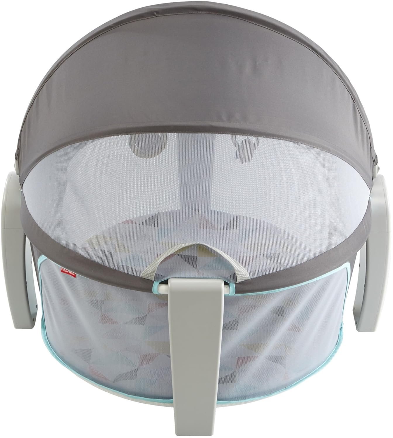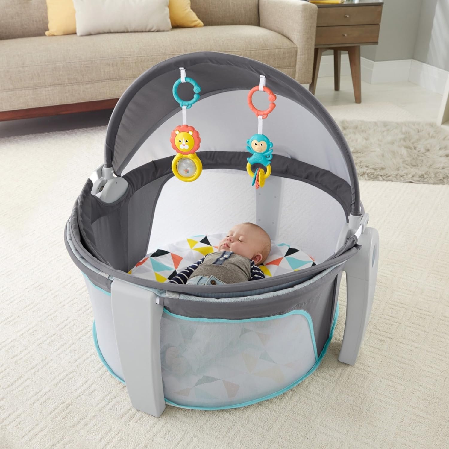 Baby feels right at home in the dome! That’s because it features a comfy pad for your little one to nap on or play on and a canopy that protects baby from sun and bugs. Use it indoors or out! Two colorful toys dangle overhead to encourage eye tracking. The toys can be removed and placed within baby’s reach for exploring the textures. And when you’re ready to pick up and go again, just fold the dome and use the handles to take it with you! It’s a great take-along for camping, picnics, a day at the beach, play dates, or a visit to grandma’s house. Where development comes into play Security & Happiness: Soft padding and sun blocking visor help baby feel secure when away from home. Fine Motor: Dome includes link toys that will keep baby busy while strengthening and developing fine motor skills.