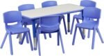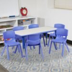 COMPLETE ACTIVITY TABLE SET: Includes one 23.6″W x 47.25″L rectangular plastic table and 6 matching chairs, ideal for classrooms, playrooms, and daycare learning spaces.