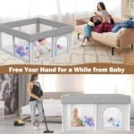 Secure zipper gate design: The playpen’s safety zipper gate lock prevents babies from opening it on their own. The unique zipper can only be opened from the outside by parents, ensuring that children inside cannot open the gate independently. This provides parents with a great sense of peace of mind, preventing children from running into danger by going outside.