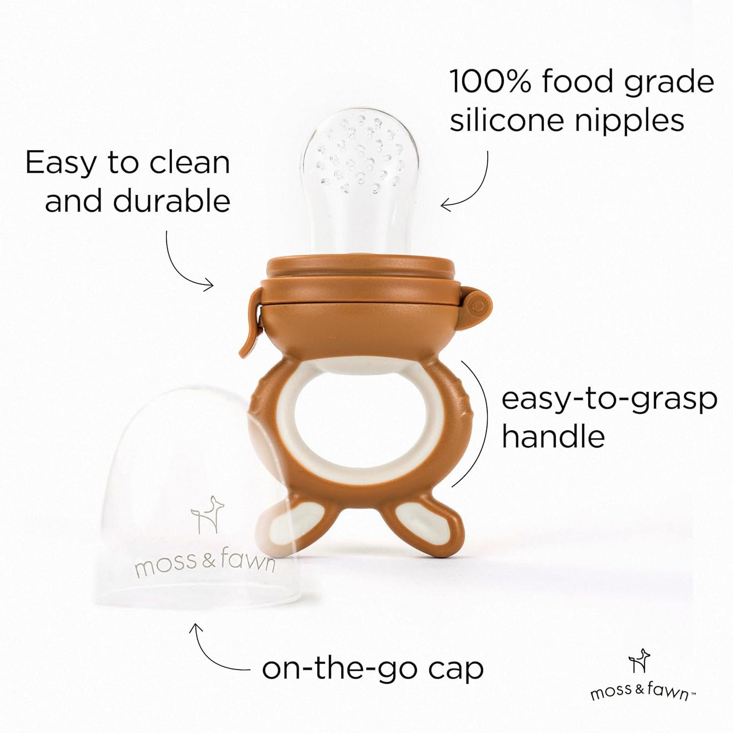 Introduction to Solids: The Moss and Fawn Forage Feeder helps infants transition from a milk-only diet to solid foods by offering a safe and manageable way to experience different flavors and textures. Our Forage feeder silicone material prevents large pieces of food from entering the baby’s mouth, reducing the risk of choking.