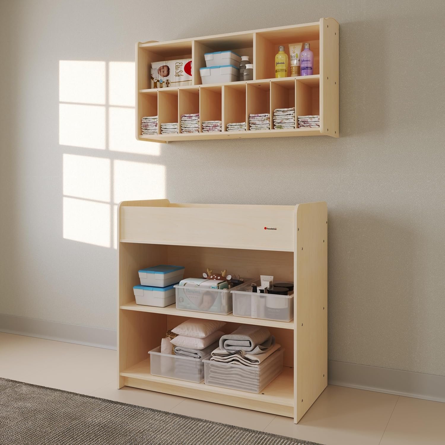 Innovative Design: Built in storage to keep your space organized and convenient access to changing essentials.