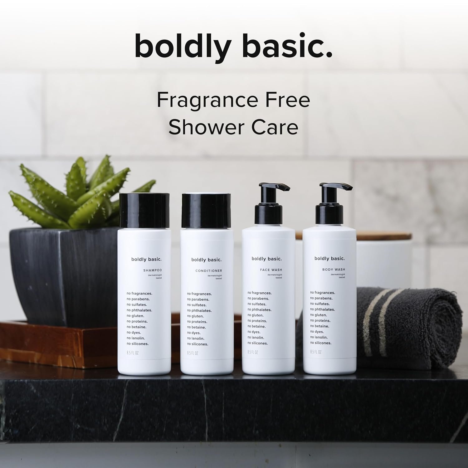 Boldly Basic Fragrance Free Shampoo, Conditioner, Body Wash & Face Wash are Dermatologist Tested products created specifically to clean your hair and skin without irritating them.