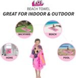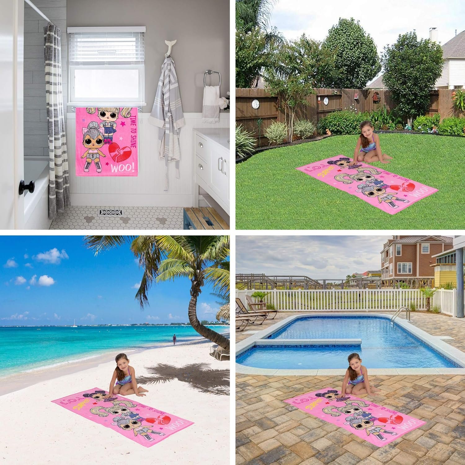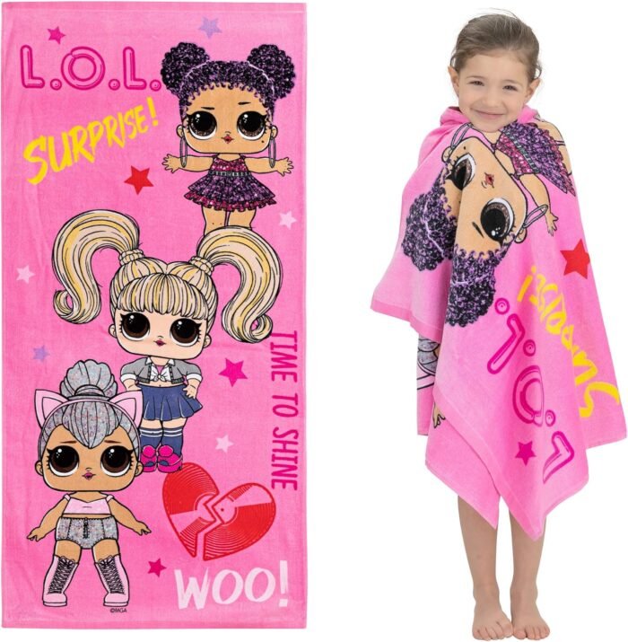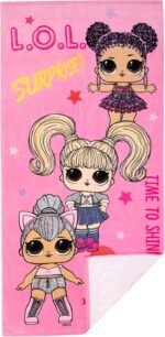 LOL SURPRISE DESIGN: This cute and colorful beach towel is the perfect pool-side accessory for every little glamor girl. This animated pink towel features adorable imagery of LOL Surprise dolls Oops Baby, Purple Queen and Kitty Queen.