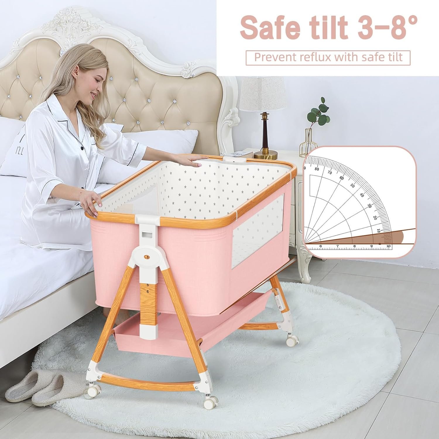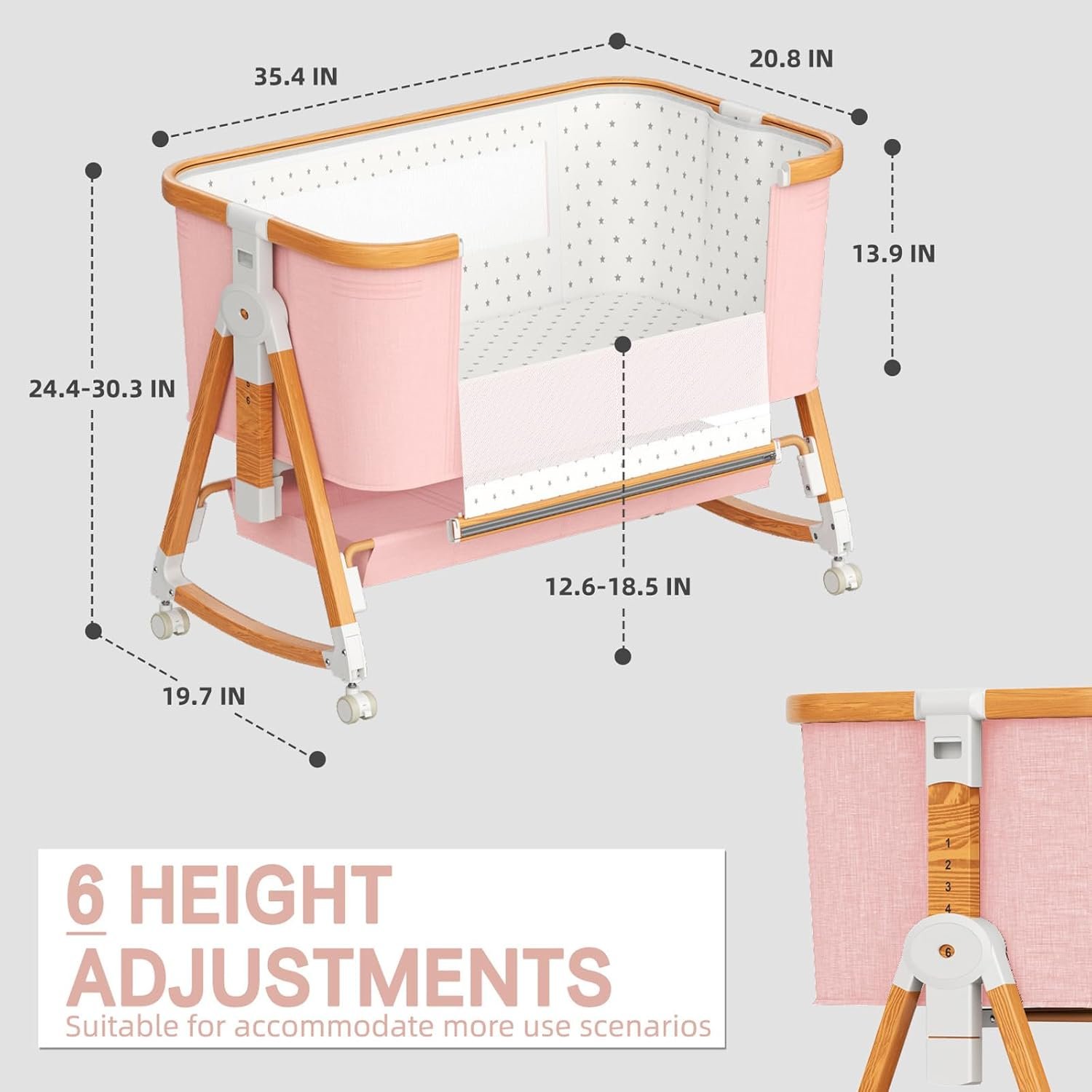 【Adjustable Height】The convertible rocking bassinet for baby has 6 adjustable heights which is suitable for different bed heights. This bassinet for baby can also be set to tilt mode for easy baby feeding and diaper changing