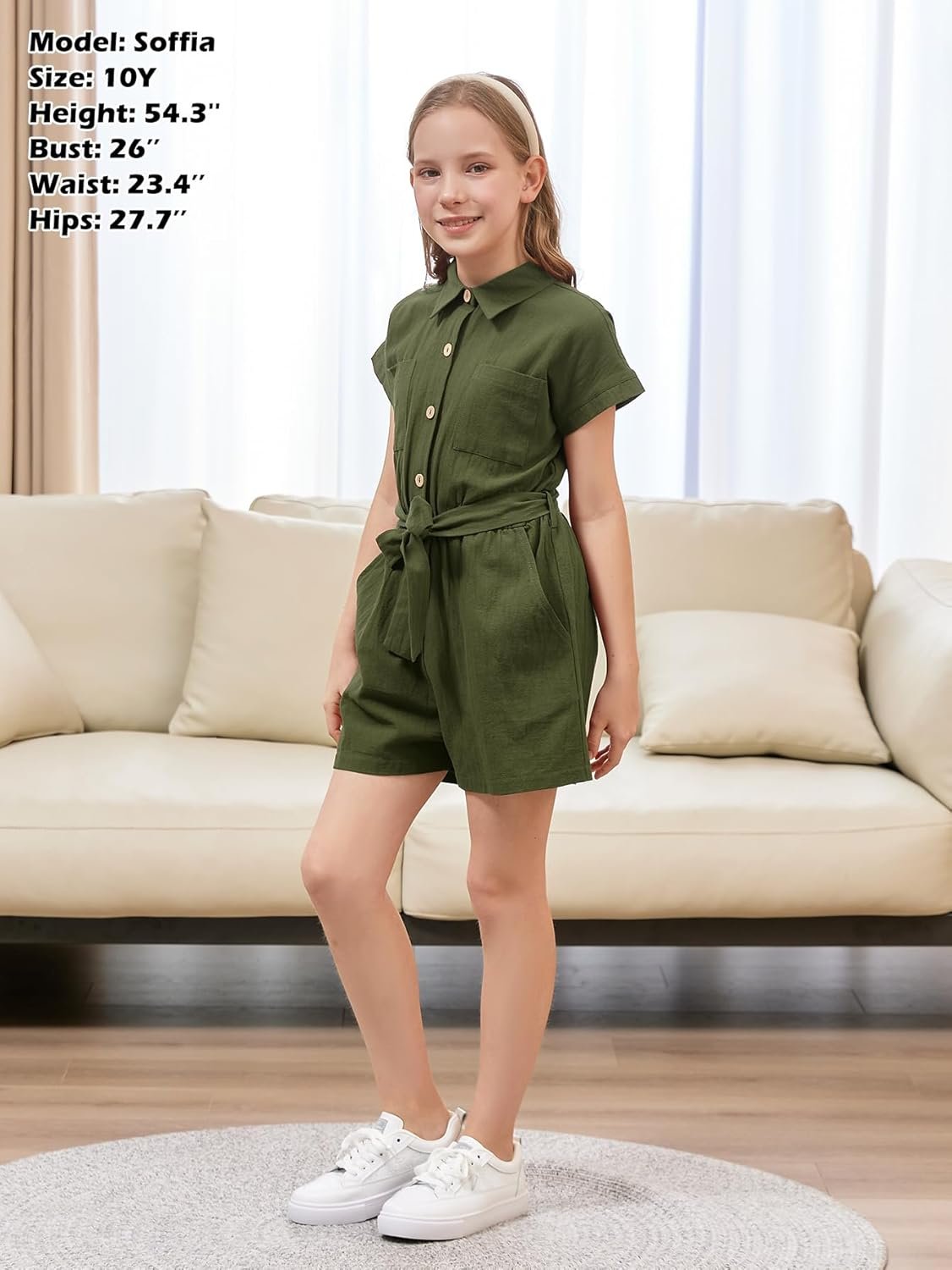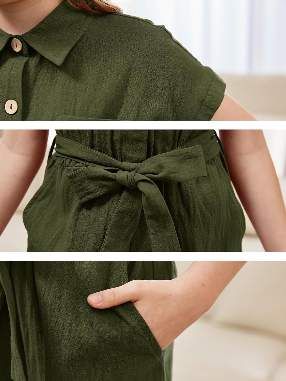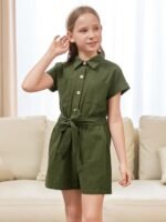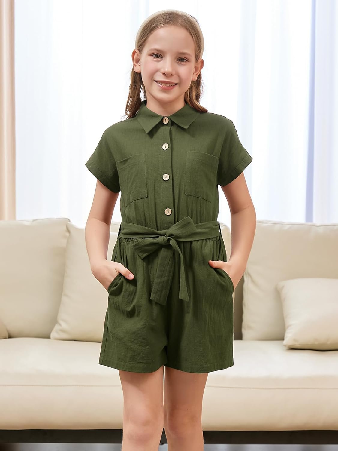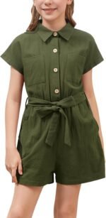 GORLYA Girls Peter Pan Collar Linen Casual Jumpsuit Outfits Button Belted Staight Leg Shorts Jumper Rompers 4-14T