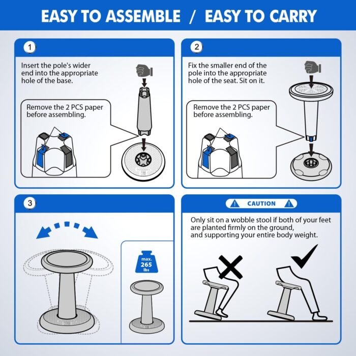 Sturdy & Easy Assembly – This active stool features a robust conical seat-stem-base connection that becomes stronger under increased pressure, supporting up to 265 lb. Additionally, the assembly requires no tools, ensuring convenience and simplicity.