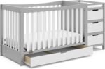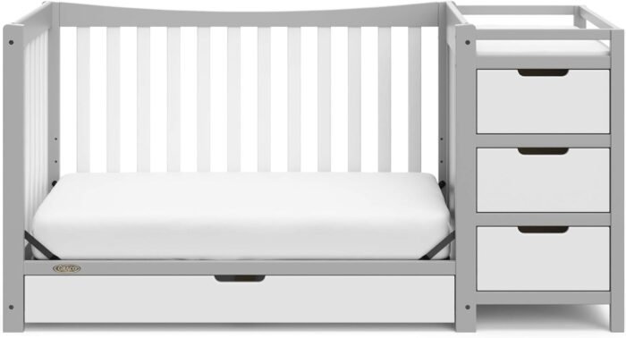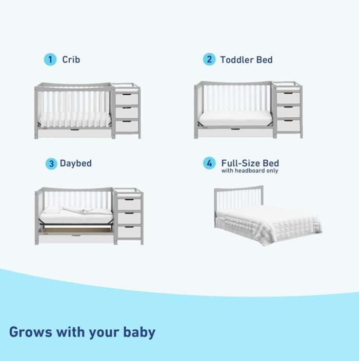 Bring your dream nursery to life with the Graco Remi 4-in-1 Convertible Crib and Changer with Drawer. With its full-size under-crib storage drawer, attached changing table with extra storage, and timeless design, the Remi is the perfect addition to any nursery. The Remi is crafted from pine wood, engineered wood, wood composites, and includes Euro drawer glides, and its applied finish has been tested to meet or exceed the applicable ASTM and CPSIA safety standards. Also, the Remi is JPMA Certified — meaning it has been expert tested by third-party, accredited laboratories to meet or exceed all of the applicable category voluntary and mandatory safety standards. Designed to adapt to your growing baby, the Remi is equipped with an adjustable mattress support base with 3 different height options, so the mattress support base’s position can be lowered as your child grows [please note, this crib may only be used until your child can easily climb out or is taller than 35 inches (89 cm)]. To support your child’s journey from babyhood to toddlerhood and beyond, the Remi can be converted from a crib to a toddler bed [compatible Graco Toddler Safety Guardrail (Slats) – 01350-30 Series sold separately)], daybed, and full-size bed with headboard only (compatible full-size bed conversion kit sold separately). The Remi is designed to accommodate any standard full-size crib & toddler mattress (mattress sold separately – we recommend any Graco crib mattress). Graco is the proud recipient of the Parent Tested Parent Approved (PTPA) Seal of Approval for nursery and children’s bedroom furniture, and the 2021-2023 Women’s Choice Award for 9 out of 10 Recommended Baby & Kids Furniture. Backed by a 1-year limited manufacturer’s warranty. Assembly required. Mattress, guardrail kit, and full-size bed conversion kit each sold separately.