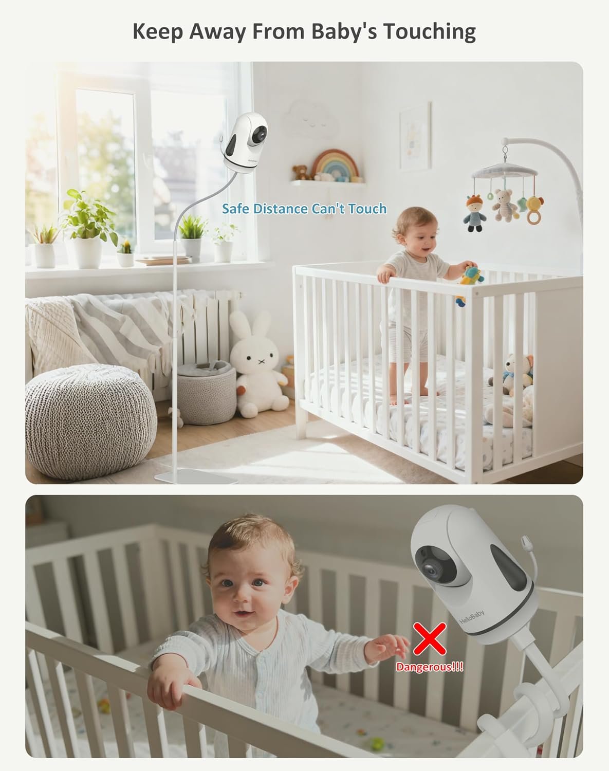 【Safety and Materials】: Safety first! Place the floor stand far from the crib, out of baby’s reach. This stops baby grabbing camera or wire, avoiding potential danger.It’s really stable. The Hello Baby mount stays firm on floor with metal base & non-slip pad. The gooseneck arm holds monitor well, interface fits tight. Base fits under crib, counterweight stops imbalance. No worry of it falling