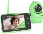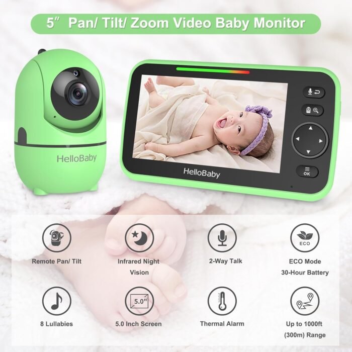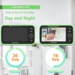 Remote 355° Pan and Tilt Baby Monitor & 5″ Color Display: Enjoy a 5″ Big Screen on this baby camera monitor. Remote control camera rotate 355° in horizontal and 120° vertical gives you a larger view of your baby’s room. 2X zoom function ensures clear visuals. Noiseless camera rotation for a peaceful environment.