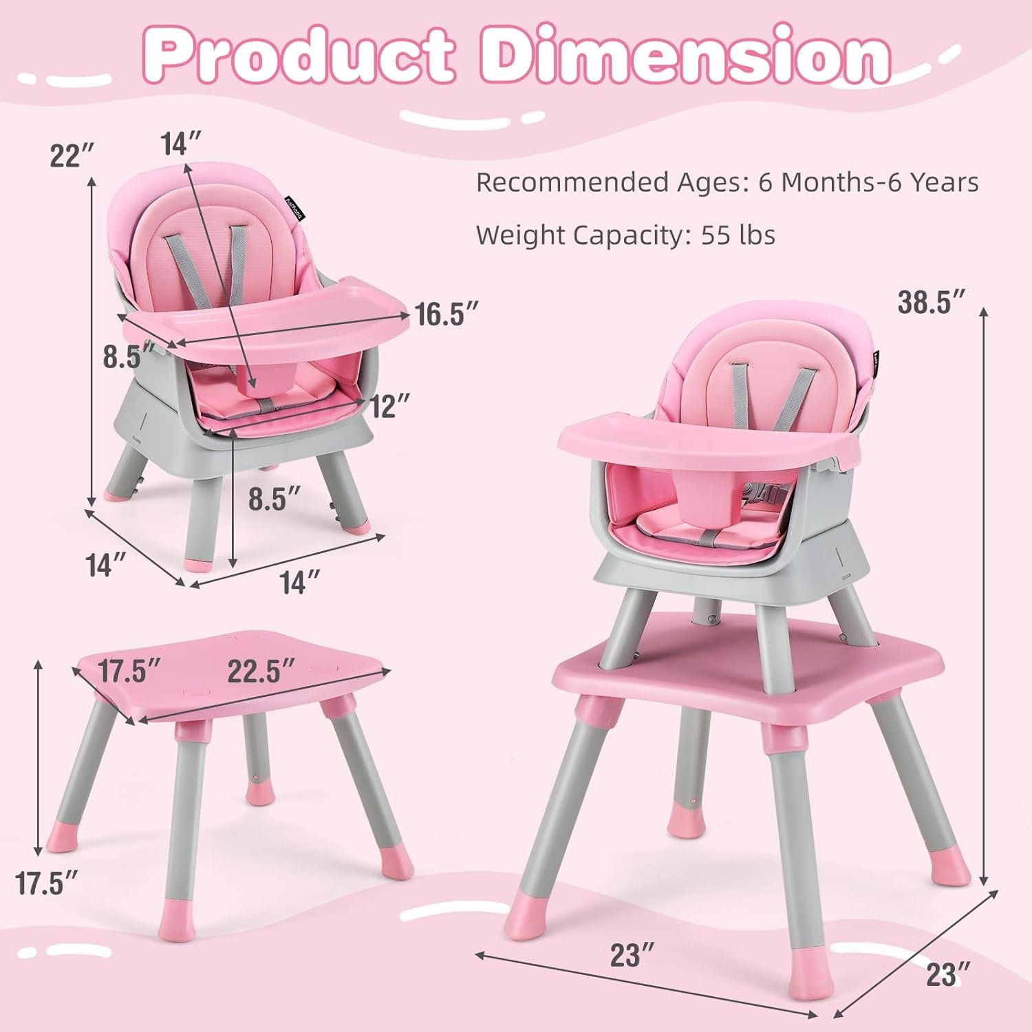 【8-in-1 Baby High Chair】 This HONEY JOY 8-in-1 high chair can be converted as full-size eating high chair; 2) toddler booster seat; 3) big kids table and chair set; 4) blocking table and chair set; 5)a mini feeding chair with food tray lowered to the floor; 6) stand-alone floor chair with padded cushion; 7) kids chair, 8) individual stool, which accompanies babies’ growth in 6 months-6 years old (55 lbs) .