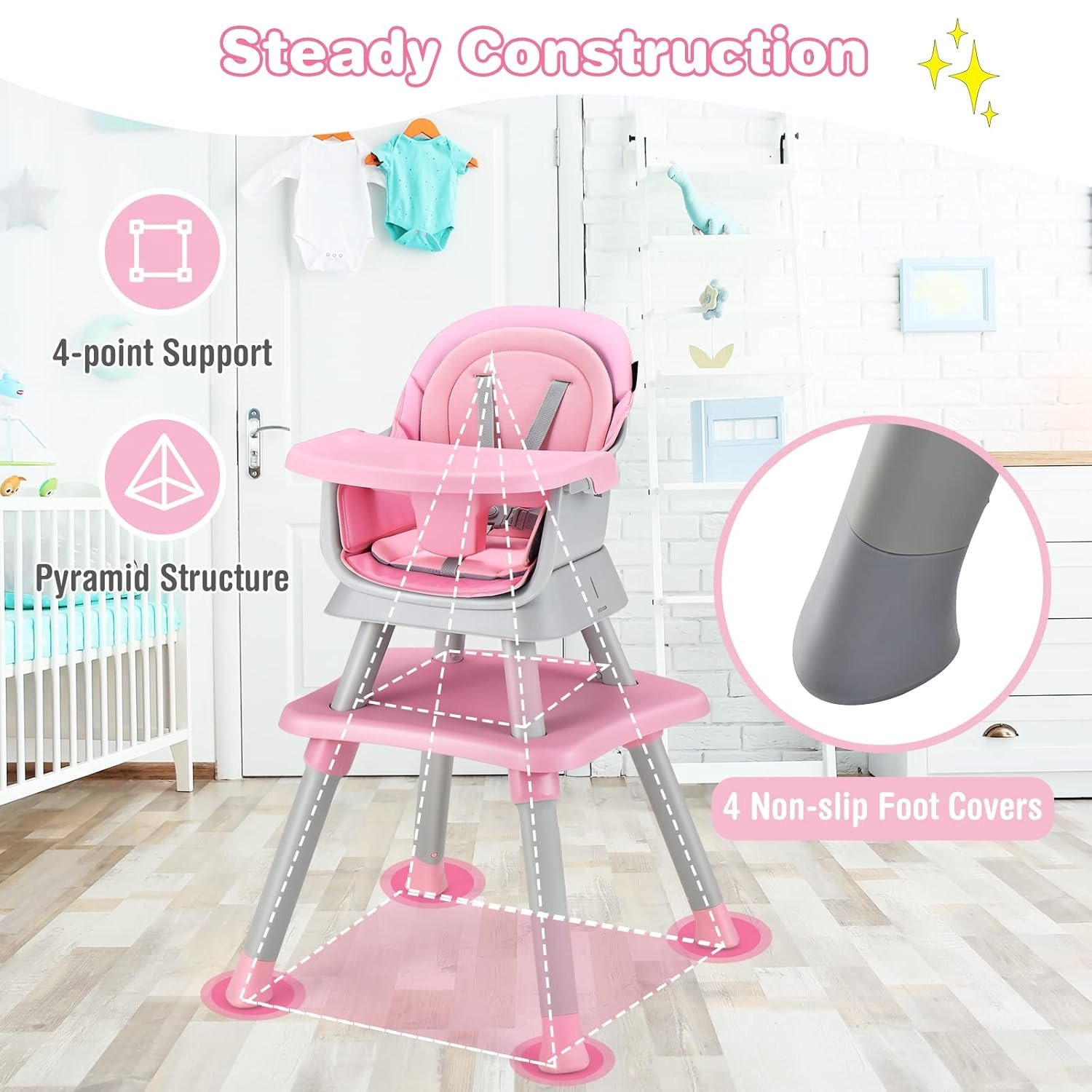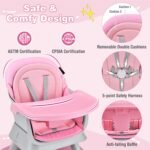 【Safe Structure & Comfy Cushion】The toddler high chair is designed with pyramid structure and the 4 non-slip foot covers, which enhance stability and protect the floor from scratches. And the double-layer cushion with 5-point harness and anti-falling baffle promises comfort and security. 3-position food tray also provides a comfy seat for grown up babies.