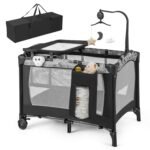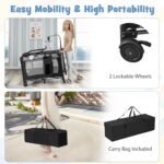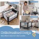 1.【Foldable & Portable Baby Playard】: This pack and play can be easily folded and then packed into a bonus Oxford carry bag for outdoor use. Even while traveling, your baby will have a comfortable area or play area. This baby playard with bassinet has lockable wheels so parents can move the bag freely around the living room.